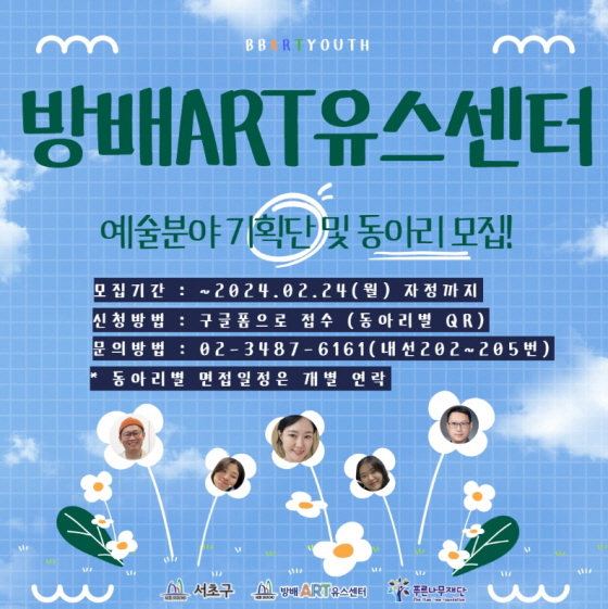 [방배아트유스센터] 예술 분야 기획단 및 동아리 모집 접수기간2025.02.01 ~ 2025.02.24 D+358 종료 참가자격 기타 제한 주최방배아트유스센터 1등상금(상품)기타 홈페이지 바로가기 첨부파일 다운로드 유의사항 ※본 내용은 참고 자료로 내용의 오류와 변동에 대해 책임지지 않습니다. (오류 및 변동 신고는 상단의 '제안/오류' 신고를 통해 해주십시오.) ※주최사 사정에 따라 일정 및 내용이 변경될 수 있으니 주최사 홈페이지 등을 통해 관련 안내를 수시로 확인하시기 바랍니다. 상세내용 ■ 제목[방배아트유스센터] 예술 분야 기획단 및 동아리 모집 ■ 개요미디어, 사진, 영상, 연극, 디지털 드로잉... 9~19세 & 20세 이상의 청소년이라면 이 중에 좋아하는 예술 한 개쯤은 있겠지‼ ■ 기간~2024.02.24.(월) 자정까지‼ ■ 참가자격20~24세, 20~29세 등 활동 내용에 따라 다름 ■ 활동내용다음 활동 내용 중 선택 지원1. 문화예술 동아리 지원사업2. 청소년창업동아리 [틴틴메이커]3. 청소년연극동아리 [필통사이]4. 청소년영상동아리 [서초통통 TV]5. 청소년사진동아리 [시선]6. 청년1인예술작가 [드로잉 크리에이터즈]7. 미디어 콘텐츠 제작단 [콘크리트]8. 마을미디어팟캐스트 [서초FM통통팟]9. 기아그린서포터즈 ■ 지원방법 및 참여 혜택홈페이지 공고 참조 ■ 유의사항자세한 활동 내용, 지원 자격 등에 대한 내용은 홈페이지 공고를 참조 바랍니다. 목록