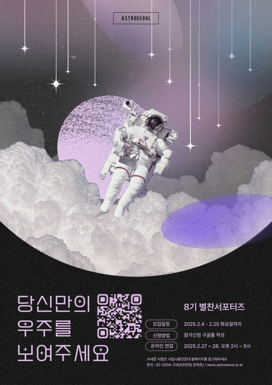 [서울시립천문대] 8기 별찬서포터즈 모집 접수기간2025.02.04 ~ 2025.02.25 D+358 종료 참가자격 대학(원)생/청년 주최서울시립천문대 1등상금(상품)기타 홈페이지 바로가기 첨부파일 다운로드 유의사항 ※본 내용은 참고 자료로 내용의 오류와 변동에 대해 책임지지 않습니다. (오류 및 변동 신고는 상단의 '제안/오류' 신고를 통해 해주십시오.) ※주최사 사정에 따라 일정 및 내용이 변경될 수 있으니 주최사 홈페이지 등을 통해 관련 안내를 수시로 확인하시기 바랍니다. 상세내용 ■ 제목[서울시립천문대] 8기 별찬서포터즈 모집 ■ 개요우주에 대해 관심이 있으신가요?별자리에 대한 낭만이 있으신가요?다양한 사람들이 모여 같이 이야기해보고 싶으신가요?별찬서포터즈에서 함께하세요!여러분들을 별에 대해 이야기할 수 있는 전문가로 만들어 드리겠습니다. ■ 기간 - 신청기간 : 2025년 2.4 ~ 2.25 까지 - 활동기간 : 2025.3.8.(토) ~ 2025.12.31.(수) ■ 참가자격 대학생 ■ 활동내용 - 망원경 관련 이론, 다루는 법, 천체관측 교육 및 실습 - 천문을 활용한 다양한 컨텐츠 체험 - 관측회 - 천문체험봉사활동 - 천문관련 프로그램 기획 및 운영 ■ 지원방법 구글 폼을 통해 지원( https://forms.gle/yJTZxArXSARohcCE9 ) ■ 참여 혜택 - 천문대 장비를 활용할 수 있는 기회 제공 - 천문관련 콘텐츠 체험 및 교육 지원 - 스피치 교육 등 전문화 교육 지원 - 활동에 따라 봉사시간 제공 - 교육 진행 시 소정의 교육비 지원 - (수료 후) 추후 천문대와 연계하여 교육 진행 가능 - 연 1회 이상 관측회 진행 - 서포터즈 위촉장 및 활동증명서 발급 - 수료시 서포터즈 수료장 발급 ■ 참고사항Q1. 언제, 어디서 활동하게 되나요?A1. 모이기 쉬운 토요일 위주의 일정을 잡았으나, 대학교 학사일정 혹은 천문대 내부사정 등으로 변경될수 있습니다. 주요 활동장소는 광진청소년센터 천문특화시설이며, 활동에 따라 외부활동이 있을 수 있습니다. Q2. 천문에 대해서 잘 알아야 하나요?A2. 아닙니다! 관심을 가지고 꾸준하게 참여하실 열정만 있다면 누구나 참여하실 수 있습니다. ■ 문의광진청소년센터 천문과학특화팀 장혁준 (02-2204-3192) 목록