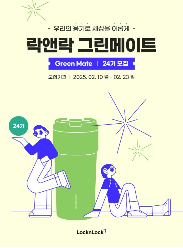 락앤락 대학생 친환경 서포터즈, 그린메이트 24기 모집 접수기간2025.02.10 ~ 2025.02.23 D+360 종료 참가자격 대학(원)생/청년 주최락앤락 1등상금(상품)기타 홈페이지 바로가기 첨부파일 다운로드 유의사항 ※본 내용은 참고 자료로 내용의 오류와 변동에 대해 책임지지 않습니다. (오류 및 변동 신고는 상단의 '제안/오류' 신고를 통해 해주십시오.) ※주최사 사정에 따라 일정 및 내용이 변경될 수 있으니 주최사 홈페이지 등을 통해 관련 안내를 수시로 확인하시기 바랍니다. 상세내용 ■ 제목락앤락 대학생 친환경 서포터즈, 그린메이트 24기 모집 ■ 기간 - 모집 기간: 2025.02.10.(금) ~ 2025.02.23(일) 23시 59분 - 최종 합격자 발표 : 2025.03.12.(수) - 발대식 : 2025.03.21.(금) - 활동 기간: 2025.03.21.(금) ~ 06.27.(금) (약 3개월) ■ 모집대상 친환경 활동에 관심이 많고 톡톡 튀는 아이디어를 가진 국내 거주 대학생(휴학생 포함) 20명 <지원 자격> - 친환경 캠페인 및 프로젝트 기획에 관심이 많고 남다른 열정이 있으신 분 - 활동 기간 내 서울 지역 오프라인 모임 참석이 가능하신 분(월 1회) - 인스타그램, 블로그 등 SNS 채널을 활발히 사용하시는 분(대외활동 계정 지양) - 사진/동영상 촬영 및 편집 등 디자인에 자신 있는 분 ■ 활동내용락앤락 제품 체험 / 매월 활동비 지원 / 우수 활동자 포상 - 제로웨이스트를 실천하는 ‘#그린메이트챌린지’ 활동 - 텀블러 사용 문화를 확산하는 ‘#굿바이 일회용 컵 챌린지’ 활동 - 지구를 위한 친환경 운동 ‘플로깅’ 진행 - 친환경 프로그램 기획 및 운영 ■ 지원방법 락앤락 블로그 공지 내용의 네이버 폼을 통한 접수 ■ 참여 혜택 - 월 별 다양한 락앤락 제품 체험 기회 - 개인/팀별 활동비 지원 및 우수 활동자 포상 제공 - 지방 거주자 교통비 지원 - 최우수 활동자 및 최우수 활동팀 상금 수여 ■ 유의사항 * 오프라인 행사 및 일정은 변동될 수 있습니다. * 상기 일정은 변동될 수 있습니다. * 발대식 불참 시 합격이 취소될 수 있습니다. * 지원서 중복 제출 시 서류 과정에 불이익이 있을 수 있습니다. 꼼꼼하게 확인 후 제출해 주세요. ■ 문의 greenmate@locknlock.com 목록