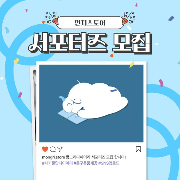 먼지스토어 다이어리 서포터즈 모집 접수기간2025.02.04 ~ 2025.02.22 D+361 종료 참가자격 대학(원)생/청년 주최먼지스토어 1등상금(상품)기타 홈페이지 바로가기 첨부파일 다운로드 유의사항 ※본 내용은 참고 자료로 내용의 오류와 변동에 대해 책임지지 않습니다. (오류 및 변동 신고는 상단의 '제안/오류' 신고를 통해 해주십시오.) ※주최사 사정에 따라 일정 및 내용이 변경될 수 있으니 주최사 홈페이지 등을 통해 관련 안내를 수시로 확인하시기 바랍니다. 상세내용 ■ 제목먼지스토어 다이어리 서포터즈 모집 ■ 개요먼지스토어의 주력 상품인 몽글이 다이어리를 홍보하기 위한 서포터즈를 기획하게 되었습니다. 단순 일반 다이어리 사용이 아닌, 다이어리 속에 담겨있는 Q&A 문답에 대한 답을 곰곰히 생각하고 적으며 삶을 돌아보고 미래을 계획하는 역할을 합니다. ■ 기간 - 모집기간 : 2025.2.4(화) ~ 2.18(화) - 활동기간 : 제품 수령 후 한달간 ■ 참가자격대학생* 2주에 하루 본사 방문필요하여 수도권 거주자 우선 지원 부탁드립니다 :) ■ 활동내용 제품 수령 후 일주일 이내 다이어리 작성+꾸미기, 다이어리 속지에 있는 문답을 정성스레 답변한 게시글 일주일에 업로드 2회 이상 ■ 지원방법구글폼 접수https://docs.google.com/forms/d/e/1FAIpQLSfbCyAO4Snv0-Ctg6AvgsQ3FH7FE0g7ht1X0Kg9FSYbR_JFVw/viewform ■ 참여 혜택- 다이어리 + 펜 등 문구용품 제공 - 제작물 먼지스토어 sns업로드- 수료증 발급 ■ 유의사항체험단 활동은 게시글 홍보, 상세페이지에 사용될 수 있습니다.활동이 부진할 시 수료증이 발급되지 않습니다. ■ 문의dust.store@gmail.com 목록