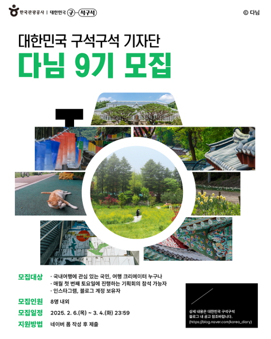 [한국관광공사] 대한민국 구석구석 기자단 다님 9기 모집 접수기간2025.02.06 ~ 2025.03.04 D+351 종료 참가자격 제한없음 주최한국관광공사 1등상금(상품)기타 홈페이지 바로가기 첨부파일 다운로드 유의사항 ※본 내용은 참고 자료로 내용의 오류와 변동에 대해 책임지지 않습니다. (오류 및 변동 신고는 상단의 '제안/오류' 신고를 통해 해주십시오.) ※주최사 사정에 따라 일정 및 내용이 변경될 수 있으니 주최사 홈페이지 등을 통해 관련 안내를 수시로 확인하시기 바랍니다. 상세내용 ■ 제목[한국관광공사] 대한민국 구석구석 기자단 다님 9기 모집 ■ 개요 다채로운 국내 여행의 매력을 보여줄 한국관광공사 대한민국 구석구석 기자단 '다님' 9기를 모집합니다! ■ 기간 - 모집기간 : 2025. 2. 6.(목) ~ 2025. 3. 4.(화) 23:59 - 1차 합격자 발표 : 2025. 3. 13.(목) 예정 - 개별 통지 - 2차 면접심사 : 2025. 3. 26.(수) 예정 - 최종 합격자 발표 : 2025. 3. 31.(월) 예정 - 대한민국 구석구석 공식 블로그 내 공지 - 발대식: 2025. 4. 5.(토) 예정 ■ 참가자격 - 국내여행에 관심 있는 국민, 여행 크리에이터 누구나 - 매월 첫 번째 토요일 진행하는 기획회의 참석 가능자 - 네이버 블로그, 인스타그램 계정 보유자 ※ 모집인원 : 8명 내외 <유의사항> ※ 기자단 '다님' 3년 이상 활동자 지원 불가 ※ '25년 군 복무 중인 자 또는 군 복무 예정자 지원 불가 ※ 한국관광공사 운영 기자단, 서포터즈 등 유사 사업 중복 활동 불가 ■ 사전미션 - 총 3건(블로그 1건, 인스타그램 2건) ※ 2025. 2. 6.(목) 이후 게시된 콘텐츠만 인정 (1) 사전미션 1 – 블로그 여행기사 1건 - 활용채널 : 네이버 블로그 - 제출규격 사진 10장 이상, 글자 수 1,000자 이상(공백 제외) 최근 1년 내 지원자 본인이 촬영한 국내여행 사진으로 구성 지원서 내 ‘지원자 강점분야-사진’ 응답 연계하여 작성 ‘대한민국 구석구석’ 블로그 양식 금지 (2) 사전미션 2 – 인스타그램 피드 2건(사진 피드 1건, 숏폼영상 1건) - 활용채널 : 인스타그램 - 제출규격 최근 1년 내 지원자 본인이 촬영한 국내여행 사진으로 구성 사진 6장 이상, 숏폼영상 30초이내(최대 60초) 사진, 숏폼 공통 피드 당 글자 수 500자 이상(공백 제외) 지원서 내 ‘지원자 강점분야-사진’, ‘지원자 강점분야-영상’ 응답 연계하여 작성 별도 양식 제한 없음 (가로/세로형 무관, 자막 삽입, 내레이션 삽입 가능) ■ 활동내용 - 매월 첫 번째 토요일 기획회의를 통한 월별 콘텐츠 선정 및 취재, - 대내외 취재 지원 및 팸투어 등을 활용한 - 국내여행 콘텐츠 제작(기사, 사진, 숏폼영상 등) 및 확산 ■ 지원방법 - 온라인 지원서(네이버 폼) 제출 : https://naver.me/F1rGHCfF * 로그인 후 작성 가능 * 2025년 트래블리더 17기 중복 지원 불가 ■ 참여 혜택 - 한국관광공사 운영 '대한민국 구석구석' 내 다님 제작 콘텐츠 선별 게시 - 국내 팸투어 및 대내외 협업 취재기회 제공 * 팸투어(Familiarization Tour) : 관광지 또는 관광상품을 홍보하기 위하여 실시하는 (사전)답사여행 - 다님 활동비 지급 등 ■ 유의사항 - 대내외 상황에 따라 세부 활동 내용이 변경될 수 있습니다. - 사진미션 제출규격 미 준수 시 부적격 처리됩니다. - 사전미션은 전체공개 처리하여 링크를 통해 확인이 가능할 경우에만 제출로 인정되며, 링크 오류 및 비공개/부분공개 등의 경우 부적격 처리됩니다. - 제출할 사전미션을 모집 마감일(2025. 3. 4. 23:59) 이후 수정할 경우 부적격 처리됩니다. ■ 문의 다님 9기 운영사무국 (운영시간: 월~금 10:00~18:00) - 메일 : imk_kto9suk9suk@thesmc.co.kr - 전화 : 070-5138-2648 목록