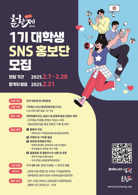 '제95회 춘향제' 1기 대학생 SNS 홍보단 모집 접수기간2025.02.07 ~ 2025.02.20 D+363 종료 참가자격 대학(원)생/청년 주최전북 남원시청 1등상금(상품)기타 홈페이지 바로가기 첨부파일 다운로드 유의사항 ※본 내용은 참고 자료로 내용의 오류와 변동에 대해 책임지지 않습니다. (오류 및 변동 신고는 상단의 '제안/오류' 신고를 통해 해주십시오.) ※주최사 사정에 따라 일정 및 내용이 변경될 수 있으니 주최사 홈페이지 등을 통해 관련 안내를 수시로 확인하시기 바랍니다. 상세내용 ■ 제목'제95회 춘향제' 1기 대학생 SNS 홍보단 모집 ■ 기간 - 모집 기간 : 25.02.07(금) ~ 25.02.20(목) - 선정 및 통보 : 25.02.21(금) - 활동 기간 : 25.03.01(토) ~ 25.05.15(목) ■ 참가자격1. 남원시 및 춘향제에 관심을 가지고 알리고 싶은 대학생2. 개인 SNS를 보유하고 활발하게 운영하고 있는 대학생3. 춘향제 축제기간 중 방문하여 현장체험이 가능한 대학생 (가산점) 외국인 학생 (교환학생 등 외국국적) (가산점) SNS 활동지수(팔로워, 좋아요, 구독, 방문자수, 조회수, 일방문자수 등)가 높은 대학생 ■ 선발인원 - 기자팀 20팀, 영상콘텐츠팀 10팀 - 팀 인원 제한없음, 1인 가능 ■ 활동내용1. 콘텐츠 제작 및 배포 - 전라북도 남원시 및 남원 춘향제 홍보를 위한 콘텐츠 제작 후 개인 SNS 및 외부 홍보채널 게시 <기자팀> 1) 월 1회 이상 춘향제 및 남원시 관련 취재 기사 작성 (최대 5회) 2) 춘향제 주요 행사, 남원시 관광명소, 지역 특산물 등 다양한 주제로 기사작성 3) 텍스트, 사진, 영상 등 다양한 형태의 콘텐츠 제작 <영상콘텐츠팀> 1) 월 1회 이상 영상 콘텐츠 기획 및 제작 (쇼츠, 웹툰 등 최대 5회) 2) 춘향제 홍보 영상, 숏폼 콘텐츠, 웹툰 등 다양한 형태의 콘텐츠 제작 3) 틱톡, 유튜브 쇼츠, 인스타그램 릴스 등 다양한 플랫폼에 게시 2. 오프라인 활동 (필참) [오리엔테이션 및 콘텐츠 마케팅 활용교육] 홍보단 기자증 수여 1) 일시: 2월 26일(수) 13:00~15:00 2) 장소: 남원시 평생학습교육관 본관 3층 [우수자 시상] 우수활동자 표창 수여 1) 일정: 5월 15일 예정 2) 장소: 추후 공지 ■ 지원방법 구글 폼 : https://forms.gle/HQKm9Sim3ahjAwyU8 ■ 참여 혜택1. 활동비 지급 - 콘텐츠제작 확인시 활동비 지급(월 1회 이상, 최대 5회 이내) 1) 기자팀 1회당 5만원 2) 영상콘텐츠팀 1회당 10만원 2. 기자증 발급 - 홍보단 선정자 대상 1기 홍보단 기자증 발급 3. 축제 방문시 특전 1) 무료 한복대여 2) 길놀이 등 참여 프로그램 우선참여 기회 부여 4. (우수활동자) 춘향제 축제 현장취재 지원 - 숙박료 및 취재비 지원 (1팀당 8만원 / 10팀 이내) 5. (우수활동자) 우수홍보단원 3명 선발 기관장 표창 1) [최우수표창] 남원시장상 1명 2) [우수표창] 남원춘향제전위원장상 2명 ■ 문의 - 1기 SNS 대학생 홍보단 모집 운영처 : 02-2102-7138 - 남원시 관광과 : 063-620-5784 ※ 문의 가능 시간 : 월~금 09:30~17:30 / 공휴일, 점심시간(12:00~13:00) 제외 목록