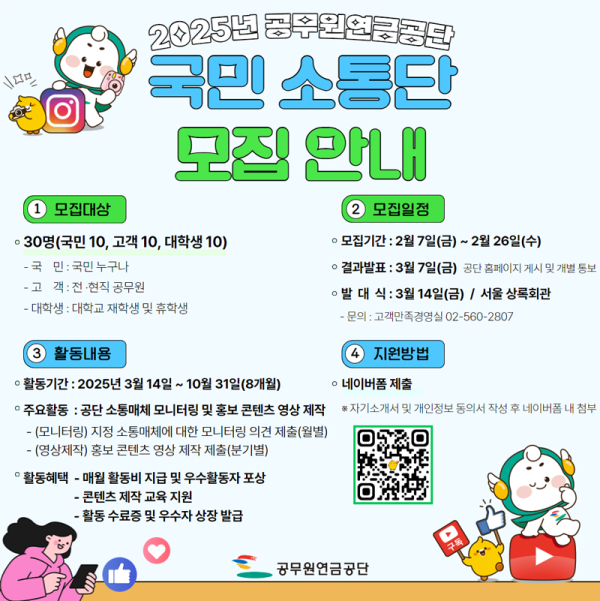 2025년 공무원연금공단 국민소통단 모집 접수기간2025.02.07 ~ 2025.02.26 D+357 종료 참가자격 제한없음 주최공무원연금공단 1등상금(상품)기타 홈페이지 바로가기 첨부파일 다운로드 유의사항 ※본 내용은 참고 자료로 내용의 오류와 변동에 대해 책임지지 않습니다. (오류 및 변동 신고는 상단의 '제안/오류' 신고를 통해 해주십시오.) ※주최사 사정에 따라 일정 및 내용이 변경될 수 있으니 주최사 홈페이지 등을 통해 관련 안내를 수시로 확인하시기 바랍니다. 상세내용 ■ 제목2025년 공무원연금공단 국민소통단 모집 ■ 개요국민 관점에서 공단 소통매체 운영을 위해 공단 홈페이지 · 유튜브 등 소통매체 모니터링과 홍보 콘텐츠 제작에 참여할 공무원연금공단 국민 소통단을 모집하오니, 관심 있는 국민들의 많은 참여 바랍니다. ■ 기간 - 신청 접수 : ʼ25. 2. 7.(금) ∼ 2. 26.(수) - 선발 발표 : ʼ25. 3. 7.(금) / 공단 홈페이지 게시 및 개별 통보 - 활동 기간 : ʼ25. 3. 14. ~ 10. 31. (8개월) ■ 참가자격공무원연금공단에 관심이 있는 국민 누구나 ※ 선발 인원 : 총 30명 (국민 10명 / 전,현직 공무원 10명 / 대학생(휴학생) 10명) ■ 활동내용미션 수행 : 개인별 공단 소통매체 모니터링 및 홍보 콘텐츠(영상) 제작 - (모니터링) 지정 소통매체에 대한 모니터링 및 개선의견 제출(총 8회 / 3~10월- (영상제작) 공단 홍보 콘텐츠(영상) 제작(총 3회 / 5월 대면 행사 : 발대식, 워크숍, 해단식 중 2회 필수 참석 - 발대식 ʼ25. 3. - 워크숍 ʼ25. 6월중 - 해단식 ʼ25. 10월말~11월초 ■ 지원방법◯ 방법 : 네이버폼 신청◯ 내용 : 지원자 정보 입력 및 필수 제출서류 첨부 - (입력 사항) 인적사항, SNS활동내역, 콘텐츠 제작 능력 등 관련 정보 - (필수 서류) 자기소개서, 개인정보수집 · 이용 동의서 ※ [별첨] 필수 제출서류(양식) ■ 참여 혜택1. 활동미션 수행 완료시 매월 소정의 활동비 지급 - 모니터링 지정 소통매체 모니터링 의견 제출 인당 3만원 / 월 - 영상제작 분기별 홍보 콘텐츠 제작 인당 5만원 / 분기 - 지원비 콘텐츠 제작 및 홍보 관련 실비 인당 3만원 이내/ 분기 2. 포상비 : 활동 실적 평가에 따른 우수 활동자 포상 - (월 별) 부문별(국민·고객·대학생) 각 1명, 총 3명 선발 : 1인당 5만원 - (종료시) 부문별(국민·고객·대학생) 각 3명, 총 9명 선발 : 1등 30만원 2등 20만원 3등 10만원 3. 수료증 발급 및 콘텐츠 제작 지원을 위한 교육 · 명함 · 기념품 등 제공 ■ 유의사항 - 신청서는 허위사실 없이 정확하게 기재하여야 하며, 접수된 서류는 일절 반환하지 않습니다. - 공단으로부터 국민 소통단 선정과 관련하여 관련 증빙자료 제출요구가 있을 경우에는 이에 응해야 하며, 신청자가 모집인원보다 부족하더라도 적합한 지원자가 없는 경우 선발하지 않음을 알려드립니다. - 활동 간 제작된 콘텐츠의 표절 및 모방, 저작권 및 초상권 침해 우려, 미풍양속을 해치는 작품 등에 대한 책임은 국민 소통단 본인에게 있으며 이 경우, 활동비를 미지급하거나 지급된 활동비를 회수할 수 있습니다 - 기관명 오류, 필수서류(자기소개서/개인정보수집·이용동의서) 미제출자, 자기소개서불성실기재자(미기재, 특정문자 반복기재, 전혀 상관없는 내용 기재 등) 제외 후 평가 - 동점자 발생시 공단 본사 소재지인 제주 지역주민 우선 선발 ■ 문의 공무원연금공단 고객만족경영실 (02-560-2807) 목록