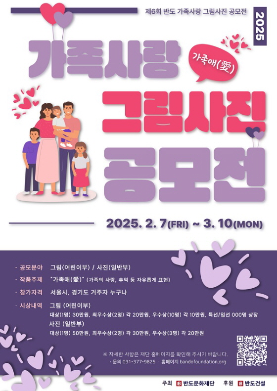 제6회 반도 가족사랑 그림사진 공모전 공모분야 사진/영상, 웹툰/포스터/미술 접수기간2025.02.07 ~ 2025.03.10 D+346 종료 참가자격 제한없음 주최반도문화재단 주관반도건설 1등상금(상품)100만원 이하 홈페이지 바로가기 첨부파일 다운로드 유의사항 ※본 내용은 참고 자료로 내용의 오류와 변동에 대해 책임지지 않습니다. (오류 및 변동 신고는 상단의 '제안/오류' 신고를 통해 해주십시오.) ※주최사 사정에 따라 일정 및 내용이 변경될 수 있으니 주최사 홈페이지 등을 통해 관련 안내를 수시로 확인하시기 바랍니다. 상세내용 ■ 제목제6회 반도 가족사랑 그림 사진 공모전 ■ 개요어린이 부 : 그림일반 성인 부 : 사진 ■ 기간1) 작품/신청서 제출 : 2025. 3. 10. (월)까지 2) 수상작 발표 : 2025. 3. 26. (수) / 재단 홈페이지 공지, 수상자 개별 문자3) 시상식 : 2025. 5. 10. (토) / 반도문화재단 아이비라운지 - 시상식 참가대상(예정) : 본상 수상자 및 가족4) 수상작 전시회 : 2025. 5. 10.(토) ~ 5. 25.(일) / 반도문화재단 아이비라운지 갤러리 ■ 참가자격서울시, 경기도 거주자 누구나 - 그림 어린이부는 초등학생 연령 이하 참가 가능 - 사진 일반부는 성인 연령 참가 가능 * 고른 기회제공을 위해 본 공모전에 2회 이상 본상 수상자는 참가대상에서 제외 (다만, 그림 어린이부 2회 이상 본상 수상자는 특선/입선에 한해 수상 될 수 있음) ■ 참여방법 / 접수방법◯ 작품주제 : “가족애(愛)”- 가족의 사랑, 추억, 생활 에피소드 등을 자유롭게 표현 ◯ 공모분야 : 그림 (어린이부) / 사진 (일반부) ◯ 출품수량 : 1인당 1점 (그림, 사진 중 택1) <작품조건>가. 그림 : 어린이부 8절 도화지 - 물감, 크래파스 등 그림 재료 제한 없음 - 손으로 직접 그린 그림만 가능 나. 사진 : 디지털 사진 - 긴 면 3,000픽셀 이상, 용량 3MB 이상, JPG/JPEG 형식 파일 ◯ 참가비 : 없음 <작품 및 신청서 제출 방법>1) 제출항목 - 공통 : 참가신청서 (작품설명서 포함) (*별첨 양식 사용) - 사진 부문 참가자 : 작품 사진 파일 - 그림 부문 참가자 : 작품 사진촬영 파일 (JPG/JPEG 형식) 또는 작품 스캔 파일 (PDF 형식) 제출 ※ 그림 부문 본상 수상작은 선정 발표 후 그림 원본을 4월 13일(일)까지 우편 또는 방문 제출해야 하며, 미제출시 수상 취소됨 * 본상 수상작 그림 우편/방문 접수처→ (18479) 경기도 화성시 동탄광역환승로 73, 207동 E262호 반도문화재단 아이비라운지 (전화 031-377-9825) 2) 제출방법 - 우측의 이메일로 제출 → bandofd2020@gmail.com - 제출 시 아래의 이메일 제목 및 파일명 작성 기준 준수 * 이메일 제목 : 가족 그림사진 공모전 응모_응모자 본인 이름 * 그림/사진 파일명 : 응모자 본인 이름_작품명 * 신청서(작품설명서 포함) 파일명 : 응모자 본인 이름_신청서 ■ 시상내용 / 혜택본상 19명 (총상금 340만원) + 참가상(특선/입선) 000명※ 5월 중 본상 수상작 전시회 개최 예정* 본상 : 상금, 상장, 수상작 작품집, 작품 액자 수여* 특선 : 그림 부문 참가자 소정 인원 – 선물, 상장, 수상작 작품집 수여* 입선 : 그림 부문 참가자 소정 인원 – 상장 수여 구분그림 (어린이부)사진 (일반부)인원상금인원상금대상1명30만원1명50만원최우수상2명각 20만원2명각 30만원우수상10명각 10만원3명각 20만원 * 소정금액 이상의 상금은 제세공과금 차감 지급 ■ 유의사항1) 고른 기회제공을 위해 본 공모전에 2회 이상 본상 수상자는 참가대상에서 제외됩니다. - 다만, 그림 어린이부 2회 이상 본상 수상자는 특선/입선에 한해 수상 될 수 있습니다.2) 출품작은 반드시 순수 창작물이어야 하며, 본 안내문의‘작품조건’에 맞지 않는 작품은 심사에서 제외될 수 있습니다.3) 그림 부문 참가자의 경우 본상 수상작 선정 발표 후 그림 원본을 4월 13일(일)까지 우편 또는 방문 제출하지 않는 경우 수상이 취소됩니다.4) 표절, 모방, 합성, 조작, 변형된 작품, 다른 공모전 등의 수상 또는 발표 작품(사진의 경우 연사 작품의 일부 또는 유사작이 타 공모전에서 수상/발표된 작품 포함), 제3자의 저작권, 초상권 등 일체의 법적 권리를 침해하는 작품은 출품을 금지합니다.- 위와 같은 작품의 출품 또는 입상으로 인한 분쟁 발생 시 모든 책임은 참가자가 지며, 참가자는 제3자의 권리 침해 등을 인지한 즉시 반도문화재단(이하 재단이라 함)에 알려야 합니다.- 입상 후 위와 같은 문제가 확인될 경우 입상 취소 및 상금 회수될 수 있으며, 향후 모든 재단 사업에 참여를 제한할 수 있습니다.5) 본상 수상작은 시상식 및 전시회 종료 후 1개월 이내에 전시 액자와 함께 택배로 수상자에게 발송 예정이며, 사업기간 및 작품 배송 중 작품이 훼손 또는 분실되더라도 참가자는 재단에 피해보상을 요구할 수 없습니다.- 또한 참가자의 주소 부정확, 연락 두절 등의 사유로 작품 반환이 지연될 경우, 재단은 시상 발표 또는 수상작 전시회 종료 1개월 이후 작품을 폐기할 수 있습니다.6) 제출서류와 작품 사진 등 일체는 반환하지 않으며, 재단은 관련 법령에 따라 일정 기간 본 사업 수행의 근거자료로 보관합니다.7) 재단은 수상작을 전시와 홍보 등에 활용하고, 이를 위한 2차 저작물 제작과 출품작의 변형․복제․배포할 권한을 가지며, 공익적 목적
