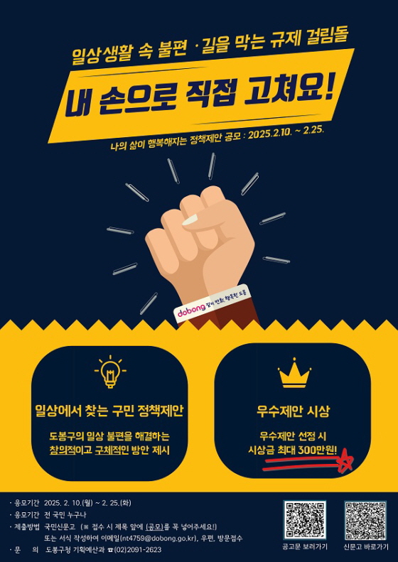 [도봉구청] 일상에서 찾는 구민 정책제안 공모 공모분야 기획/아이디어/마케팅, 정책 제안 접수기간2025.02.10 ~ 2025.02.25 D+359 종료 참가자격 제한없음 주최도봉구청 1등상금(상품)200만원~499만원 홈페이지 바로가기 첨부파일 다운로드 유의사항 ※본 내용은 참고 자료로 내용의 오류와 변동에 대해 책임지지 않습니다. (오류 및 변동 신고는 상단의 '제안/오류' 신고를 통해 해주십시오.) ※주최사 사정에 따라 일정 및 내용이 변경될 수 있으니 주최사 홈페이지 등을 통해 관련 안내를 수시로 확인하시기 바랍니다. 상세내용 ■ 제목[도봉구청] 일상에서 찾는 구민 정책제안 공모 ■ 기간 - 접수기간 : 2025. 2. 10.(월) ~ 2. 25.(화) 18:00까지 - 시상일시 : 2025년 3월 중 (도봉구청 홈페이지 공고 및 개별 통보) ■ 참가자격 도봉구에 관심 있는 국민 누구나 (거주지 제한 없음) ■ 참여방법 / 접수방법<공모주제>도봉구의 일상에서 겪는 불편사항 개선 아이디어 <참여방법>(1) 국민신문고 ※ 반드시 제안 제목 앞에 (공모) 문구 삽입 ▷ 제목: (공모) 도봉구 ○○○ 개선 제안 - 해당 문구가 없을 경우 공모전 응모가 아닌 일반 제안으로 간주 (2) 전자우편 : nt4759@dobong.go.kr※ 전자우편 제출 시 제목 : 도봉구 아이디어 공모 제출 (3) 등기우편 : (우 01331) 서울특별시 도봉구 마들로 656, 도봉구청 5층 기획예산과 제안제도 담당 (4) 방문접수 ※ (2)~(4) 공통 : 붙임 제안서 및 개인정보 이용 동의서 작성하여 각 접수처로 제출 ■ 시상내용 / 혜택 우수제안 채택 시 시상금 지급 시상등급금 상은 상동 상장려상노력제안시 상 금300만원200만원100만원50만원30만원 ※ 등급에 해당하는 제안이 없을 시, 선정 및 시상하지 않을 수 있음 ■ 유의사항 ○ 접수마감일 18:00까지 도착분에 한하여 유효 ○ 접수된 모든 서류는 반환하지 않으며 응모자의 개인정보는 공모 진행 용도로만 사용 ○ 동일한 내용의 제안이 접수되는 경우, 먼저 접수된 아이디어를 심사대상으로 선정 ○ 신청서류는 지정서식을 준수하고, 제안내용이 표절 등 기타 부정한 방법에 의한 경우 심사대상에서 제외되며, 시상 이후 발견되었을 시에는 시상금 환수 조치 ○ 부정확한 연락처 입력으로 유선연락이 불가한 경우, 수상 취소 등 불이익을 받을 수 있음 ○ 유의사항·공고문 미숙지로 인하여 발생하는 문제는 응모자의 책임으로 간주 ○ 수상작은 도봉구의 사업반영 및 홍보자료로 활용될 수 있음 (필요 시 수정 또는 변형하여 사용) ○ 그 밖의 관련 사항은 「서울특별시 도봉구 제안제도 운영에 관한 조례 시행규칙」에 따름 ■ 문의 - 도봉구청 기획예산과 창의혁신팀 (02-2091-2623) 목록