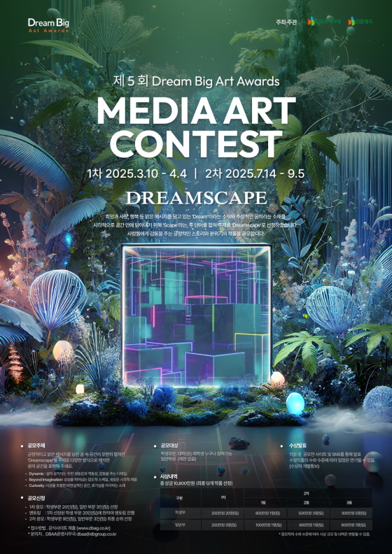 제5회 Dream Big Art Awards 미디어아트 공모전 공모분야 사진/영상, 웹툰/포스터/미술 접수기간2025.03.10 ~ 2025.04.04 D+321 종료 참가자격 제한없음 주최DB손해보험, DB월드 1등상금(상품)500만원~1천만원 홈페이지 바로가기 첨부파일 다운로드 유의사항 ※본 내용은 참고 자료로 내용의 오류와 변동에 대해 책임지지 않습니다. (오류 및 변동 신고는 상단의 '제안/오류' 신고를 통해 해주십시오.) ※주최사 사정에 따라 일정 및 내용이 변경될 수 있으니 주최사 홈페이지 등을 통해 관련 안내를 수시로 확인하시기 바랍니다. 상세내용 ■ 제목제5회 Dream Big Art Awards 미디어아트 공모전 ■ 개요 희망과 사랑, 행복 등 밝은 메시지를 담고 있는 ‘Dream’이라는 소재와 추상적인 꿈이라는 소재를 시각적으로 공간 안에 담아내기 위해 ‘Scape’라는 두 단어를 합쳐 ‘Dreamscape’를 주제로 선정하였습니다. 사람들에게 감동을 주는 긍정적인 스토리와 분위기의 작품을 공모합니다. 공모전은 1,2차로 진행되며, 1차 선정작에 한하여 멘토링을 지원하고 수상작은 DBAG 온라인 사이트와 DB금융센터 미디어월 (전시일정미정)에 전시됩니다. ■ 기간 - 접수 : 2025년 3월 10일~4월 4일 18:00 마감 - 1차 결과 발표 : 2025년 6월 중 - 멘토링 : 2025년 6월~7월 - 2차 접수 : 2025년 7월 14일~9월 5일 18:00 마감 - 최종 결과 발표 : 2025년 11월 중 ■ 참가자격▪ 학생 부문: 대학(원) 재학생 ▪ 일반 부문:제한 없음 ※ 팀으로 참여시 인원제한 없음(대표자 1인 선정, 대표자에게 상금 지급) ■ 참여방법 / 접수방법<공모 분야>▪ 미디어아트 콘텐츠 - 디지털 화면으로 송출 가능한 모든 영상 콘텐츠 - 단순 촬영 영상 불가 - 시민들에게 시각적 즐거움을 줄 수 있는 대중의 눈높이를 고려한 작품 <공모 주제>▪ 긍정적이고 밝은 메시지를 담은 꿈 속 공간이 무한히 펼쳐지는 ‘Dreamscape’를 주제로 다양한 방식으로 해석한 꿈의 공간을 표현해 주세요. - Dynamic: 살아 움직이는 듯한 생동감과 역동성, 감동을 주는 디테일 - Beyond Imagination: 상상을 뛰어넘는 압도적 스케일, 새로운 시각적 체험 - Curiosity: 시공을 초월한 비현실적인 공간, 호기심을 자극하는 소재 <1차/2차 제출물 – 양식은 홈페이지 공고문에서 다운로드>(1) 참가신청서(pdf)(2) 작품 파일(3) 작업계획서(4) 재학증명서 (학생 부문만 제출)(5) 저작권 관련 증빙서류(6) 생성형 AI 사용설명서 ※ 생성형 AI를 사용하여 출품할 경우 아래 내용이 포함된 ‘생성형 AI 사용설명서’ 파일 제출(‘기타 제출’에 업로드) - 생성형 AI 이름/버전/사용비율, 제작과정, 각 과정별/프로그램별 작업 히스토리 <작품 규격>▪ 출품 규격에 맞지 않는 출품작은 심사에서 제외 ▪ 평가의 공정성을 위하여 영상 내에 회사명 및 로고, 출품자를 알 수 있는 표기 금지 - 확장자 MP4 - 스크린 사이즈 (W)9,920 x (H)4,000 - 해상도 (W)3,968 x (H)1,600 - 런타임 : 1차 응모 20초~30초 이내의 하이라이트 영상 / 2차 응모 1분~1분 30초 이내의 영상 - 용량 30MB 이내로 제출(수상작에 한하여 원본 추후 제출) - 파일명 이름(혹은 팀명)_작품명.mp4 <제출 방법>▪ 공식 사이트 Dream Big Art Gallery를 통해 제출 ▪ Dream Big Art Gallery에 등록 후 공모전 응모 페이지에서 제출물 업로드 ▪ 개인정보 수집 및 이용동의서, 서약서, 유의사항 동의서는 응모 페이지에서 동의 체크 필수(붙임내용 참고) ■ 시상내용 / 혜택▪ 1차 시상 : 작품제작지원비 (총 4,600만원) - 학생 부문 200만원 20인(팀) - 일반 부문 200만원 3인(팀) ▪ 최종 시상 (총 6,200만원) - 학생 부문 : 대상 800만원 1인(팀) / 최우수상 500만원 3인(팀) / 우수상 300만원 5인(팀) - 일반 부문 : 대상 1000만원 1인(팀) / 최우수상 800만원 1인(팀) / 우수상 600만원 1인(팀) ※ 제세 공과금은 수상자 부담(제세공과금 공제 후 지급) ※ 학생 부문은 상금이 대학을 통해 장학금 형태로 지급되므로 대학에서 지급이 불가한 경우 수상에서 제외됨 (재학증명서 확인 필수) ※ 수상자는 상금 수령을 위해 추가적인 이용 동의 및 개인정보를 제공하여야 하며 전시 등의 목적으로 사이즈 변경 및 원본을 요청할 수 있음 ■ 유의사항▪ 개인, 팀 출품 수의 제한은 없으나 한명이 여러 팀에 참여할 수 없음. ▪ 제출된 모든 작품은 공식적인 온라인 홍보수단으로 사용 될 수 있음. ▪ 심사 및 평가는 심사위원회의 심사에 의거하며, 세부 심사기준 및 내용은 심사과정에서 조정될 수 있음. ▪ 출품자는 심사 결과에 대해 이의를 제기할 수 없음. ▪ 여러 작품이 수상작으로 선정된 경우, 가장 높은 훈격 및 상금에 해당하는 하나의 작품만을 시상함. ▪ 타 공모전 수상작, 타인의 물·명의 도용 등의 경우 심사 제외, 수상 취소 및 상금을 환수할 수 있음. ▪ 수상작은 DB그룹 홍보관 등에 전시될 수 있음. ▪ 수상시 원본 파일을 제출하여야 하므로 반드시 별도 보관 필요함. <저작권>▪ 출품작에 대한 저작권은 출품자에게 있음. ▪ 출품작이 타인의 초상권·저작권 침해와 관련된 사항은 출품자의 책임으로 하며, 타인의 저작권을 침해했을 경우 수상이 취소됨. ▪ 향후 주최 측은 필요한 경우 수상작에 대한 저작권을 양도받거나 이용 허락을 받을 수 있으며, 이 경우 출품자와 별도로 약정
