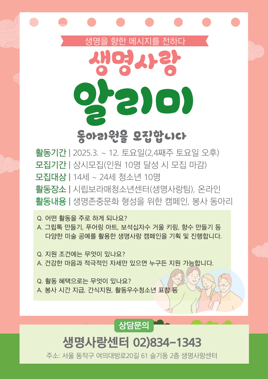 생명존중,자살예방 캠페인, 홍보 동아리 '생명사랑 알리미' 신규 동아리원 모집 접수기간2025.02.09 ~ 2025.05.31 D+264 종료 참가자격 청소년 주최시립보라매청소년센터 1등상금(상품)기타 홈페이지 바로가기 첨부파일 다운로드 유의사항 ※본 내용은 참고 자료로 내용의 오류와 변동에 대해 책임지지 않습니다. (오류 및 변동 신고는 상단의 '제안/오류' 신고를 통해 해주십시오.) ※주최사 사정에 따라 일정 및 내용이 변경될 수 있으니 주최사 홈페이지 등을 통해 관련 안내를 수시로 확인하시기 바랍니다. 상세내용 ■ 제목생명존중,자살예방 캠페인, 홍보 동아리 '생명사랑 알리미' 신규 동아리원 모집 ■ 기간- 모집기간 : 상시모집 (선착순 모집으로 진행되며 신청자 10명 달성 시 마감) - 활동 기간: 2025년 4월~ 12월(시험기간 제외) ■ 참가자격- 청소년 교육에 관심있는 14~24세 청소년!- 청소년 상담사 및 심리 관련 진로를 희망하는 청소년!- 청소년, 상담 사범 관련 전공을 하고 있는 대학생! * 특별한 자격 조건 없이 연령대만 일치한다면 환영합니다~ ■ 활동내용- 활동 시수: 주 2~4회 정기회의 및 활동 진행 - 활동 장소: 시립보라매청소년센터 슬기동 2층, 생명사랑센터 및 온라인 화상회의 (주소: 서울 동작구 여의대방로 20길 61, 슬기동 2층) [2025년 동아리 활동 예정 내용] - 부스 및 상담 관련 프로그램 기획 교육 및 프로그램 진행 간 활동수칙 안내 - 푸어링 아트, 백드롭 페인팅, 보석 십자수 등 캠페인 진행 기자재 활용 교육 진행 - 생명존중, 자살예방 프로그램 및 부스 기획 및 진행 - 센터 내부 축제 및 지역사회 연계 축제 부스 운영 - 시립보라매청소년센터 내부 동아리 연합 인준식 및 송년잔치 참여(청소년 동아리 교류 활동) ■ 지원방법- 구글 폼 신청서 작성 : https://forms.gle/AmJaMp5eEiFhFXPM9 ■ 참여 혜택 - 연중 활동 비용 및 간식비 지원 - 자원봉사시간 입력(축제 부스 및 재능기부 프로그램 운영 시) - 활동우수청소년 표창(센터장상) 수여(진행회기 내 성실히 참여한 청소년 대상으로 기회 부여) ■ 문의생명사랑팀 원소영 02-834-1343- 문의 가능 시간: 화-토 9:00~18:00 (일,월은 센터 휴관일이므로 전화 응대가 불가합니다) 목록