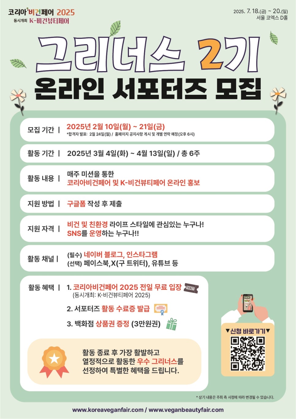 코리아비건페어 2025 온라인 서포터즈 그리너스 2기 모집 접수기간2025.02.10 ~ 2025.02.21 D+364 종료 참가자격 제한없음 주최한국국제전시, 큐노 1등상금(상품)기타 홈페이지 바로가기 첨부파일 다운로드 유의사항 ※본 내용은 참고 자료로 내용의 오류와 변동에 대해 책임지지 않습니다. (오류 및 변동 신고는 상단의 '제안/오류' 신고를 통해 해주십시오.) ※주최사 사정에 따라 일정 및 내용이 변경될 수 있으니 주최사 홈페이지 등을 통해 관련 안내를 수시로 확인하시기 바랍니다. 상세내용 ■ 제목코리아비건페어 2025 온라인 서포터즈 그리너스 2기 모집 ■ 개요025년 7월 18일(금) - 20일(일), 코엑스에서 개최되는'코리아비건페어 2025(동시개최: K-비건뷰티페어)' 서포터즈, 그리너스를 모집합니다! ■ 기간 - 모집 기간 : 2월 10일(월) ~ 21일(금) - 합격자 발표 : 2월 24일(월) 홈페이지 공지사항(18시 예정) 및 개별 연락 예정 - 활동 기간 : 3월 4일(화) ~ 4월 13일(일) / 6주 간 ■ 참가자격 개인 SNS를 보유하고, 비건 & 친환경에 관심 있는 모든 분들! ※ 모집 인원 : 00명 ■ 활동내용매주 미션을 통한 온라인 홍보 활동, 관람객들 모집 홍보- 활동 플랫폼 : (필수) 네이버 블로그, 인스타그램 / (기타) 페이스북, X(트위터), 유튜브 ■ 지원방법구글폼 신청서 작성 : https://forms.gle/Hti9zX4uT3nQrMHc9 ■ 참여 혜택 - 코리아비건페어 2025(동시개최: K-비건뷰티페어) 전일 무료 입장 - 그리너스 활동 수료증 발급 - 백화점 상품권(3만원 권) 증정 + 우수 그리너스 특별 혜택 제공 ■ 문의 - Tel. 02-761-2586, 2530 - E-mail. info@koreaveganfair.com - Homepage. www.koreaveganfair.com 목록