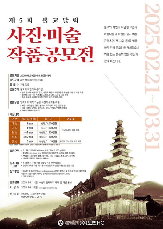 제5회 불교 달력 사진ᐧ미술 작품 공모전 공모분야 사진/영상, 웹툰/포스터/미술 접수기간2025.02.21 ~ 2025.03.31 D+326 종료 참가자격 제한없음 주최대한불교조계종 사업지주회사 ㈜도반HC 1등상금(상품)500만원~1천만원 홈페이지 바로가기 첨부파일 다운로드 유의사항 ※본 내용은 참고 자료로 내용의 오류와 변동에 대해 책임지지 않습니다. (오류 및 변동 신고는 상단의 '제안/오류' 신고를 통해 해주십시오.) ※주최사 사정에 따라 일정 및 내용이 변경될 수 있으니 주최사 홈페이지 등을 통해 관련 안내를 수시로 확인하시기 바랍니다. 상세내용 ■ 제목제5회 불교 달력 사진ᐧ미술 작품 공모전 (1등 상금 1천만원) ■ 개요불교와 자연의 다양한 모습과 아름다움이 표현된 불교 예술 콘텐츠(사진·그림 등)를 발굴하기 위해 제5회 불교 달력 사진·미술 작품 공모전을 개최하오니 역량 있는 분들의 많은 관심과 참여 바랍니다. ■ 기간 - 공모기간 : 2025년 2월 21일(금) ~ 2025년 3월 31일(월)까지 - 결과발표 : 2025. 04. 11(금) ※ 수상자 홈페이지 게재 및 개별 통보 - 시상식 : 2025. 04. 18(금) ※ 상기 일정은 사정에 따라 변동 가능 ■ 참가자격제한 없음(개인 또는 단체/만 18세 미만 미성년자는 법정대리인 동의서 필수) ■ 참여방법 / 접수방법<공모주제> 불교와 자연의 아름다움 - 불교 정서에 어긋나지 않고, 불교와 자연의 아름다움을 표현한 사진 및 미술 작품 - 봄·여름·가을·겨울 사계절을 조화롭게 담은 사진 및 미술 작품 - 특정 주제를 정하여 12컷을 구성한 사진 및 미술 작품 <공모부분> 불교 달력으로 제작 가능한 사진 및 미술 작품 - 사진 : 사찰풍경, 연꽃, 동자승, 해외성지, 석탑, 꽃살문 등 - 미술 : 캘리, 달마도, 일러스트, 판화, 수묵화, 어반스케치 등 ※ 동자승 사진 작품 출품 시 가산점 부여 <출품수 : 제한 없음> <출품규격> - 크 기 : 가로·세로 400mm 이상 / 해상도 300dpi 이상 - 확장자 : jpg, jpeg, png 이미지 파일(출품자명.zip으로 압축 후 제출) - 파일명 : 사진 (촬영 장소_작가명) / 미술 (작품명_소재_크기_작가명) ※ 수작업 작품의 경우 고화질 스캔본 파일로 제출 <필수제출서류> - 참가신청서 / 개인정보 수집 및 이용 동의서(붙임1) - 입상작 저작물 이용 허가 동의서(붙임2) / 신분증 사본 및 통장 사본 <참가방법> - ㈜도반HC 홈페이지(www.dobanhc.co.kr)에서 신청서 및 동의서 양식을 내려받아 작성 후 작품과 함께 이메일 접수(dobancalendar@naver.com) ※ 우편 및 방문 접수 불가 ■ 시상내용 / 혜택 구분(개인 또는 단체)시상 내역작품수대상 1명(팀)상장 · 1,000만원12컷의 사진ᐧ미술 작품금상 1명(팀)상장 · 300만원은상 최대 2명(팀)각 상장 · 200만원동상 최대 2명(팀)각 상장 · 100만원입선 0명(팀)각 상장 · 10만원 컷당 별도 지급(사진만 가능) ※ 상금은 세금 공제 후(원천징수) 지급되며, 심사 결과 적합한 수상작이 없으면 시상하지 않을 수도 있습니다. ■ 유의사항- 응모작과 제출 서류는 출품 이후 수정이나 반환되지 않으며, 수상작을 제외한 작품과 제출 서류는 발표일로부터 1개월 이내 모두 폐기한다. - 작품 제출 시 참가신청서, 개인정보 수집‧이용 동의서, 입상작 저작물 이용 허가 동의서, 신분증 사본, 통장 사본을 제출해야 하며, 제출 서류가 미비할 경우 심사 대상에서 제외될 수 있다.- 응모작은 개인 또는 단체로 제출하며, 단체로 제출한 작품이 선정되는 경우 단체명으로 시상한다.- 상금에 대한 제세공과금은 상금에서 공제한다. (원천징수)- 수상자는 수상 거부를 할 수 없고, 수상작에 대한 저작권료(2차 저작권 포함)는 수상에 따른 상금으로 대체되므로 수상작의 저작재산권은 주최 측에 귀속되며 공모전에 응모할 때 이에 동의하는 것으로 간주한다.- 응모작의 저작권은 응모자에게 있고 수상작에만 저작재산권은 주최측에 귀속되며, 주최측의 제작물(달력, 포스터, 브로슈어, 책자, 홈페이지, SNS 등 온·오프라인의 기타 홍보물)에 활용 배포 등을 할 수 있다. 또한, 주최 측은 저작물에 대한 포괄적 이용 권한을 갖는다. (사업상 목적 범위 안에서 수상작 전체나 일부를 변경하여 이용할 수 있다.)- 응모작은 반드시 응모자 본인의 순수한 창작 작품이어야 하고 생성형 AI 사용, 과도한 합성·변형, 타 공모전 입상·모방·도용·표절 작품으로 판명될 때 심사에서 제외되며 수상 이후라도 판명 시 수상 취소와 상금을 반환한다. 또한 수상 이후 초상권, 저작권, 명예훼손 등의 분쟁이 발생할 때도 수상 취소와 상금을 반환한다. - 응모자의 귀책 사유로 발생한 모든 분쟁 및 법적 문제 발생 시 책임은 응모자에게 있고 주최 측의 손실에 대하여 주최 측은 응모자에게 배상 청구를 할 수 있으며 응모자는 배상책임을 진다.- 공정한 심사를 위해 심사위원 및 심사 점수 등 심사 과정 일체는 공개하지 않으며 심사 결과에 대한 이의제기는 불가하고, 시상 작품 수가 조정되거나 수상작이 없을 수 있다.- 위에 언급되지 않은 내용은 주최 측의 결정에 따른 것을 원칙으로 한다. ■ 문의㈜도반HC 디자인사업부 달력팀 02)720-0671, 0678 목록