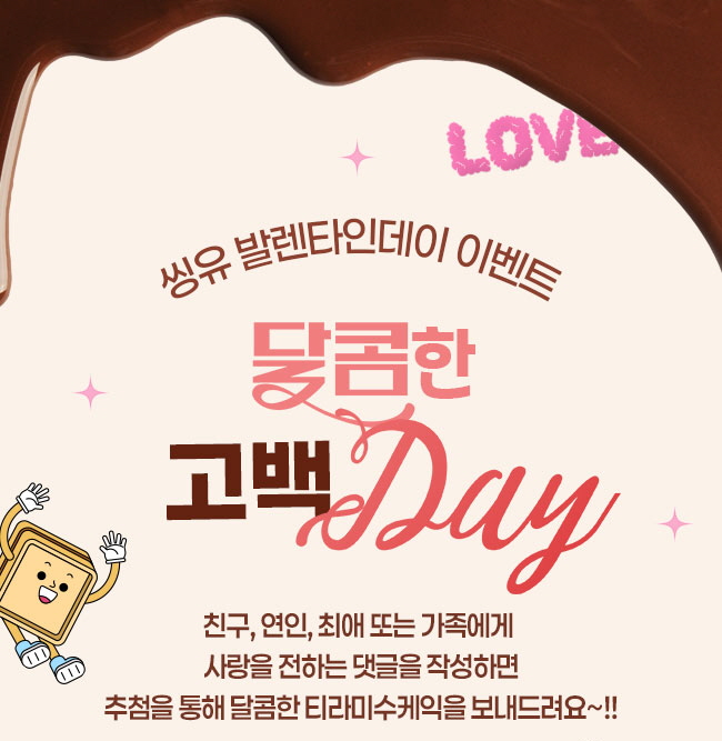 [씽유] 발렌타인데이 이벤트 ‘달콤한 고백 데이’ 접수기간2025.02.10 ~ 2025.02.23 D+362 종료 참가자격 제한없음 주최씽유 1등상금(상품)기타 홈페이지 바로가기 첨부파일 다운로드 유의사항 ※본 내용은 참고 자료로 내용의 오류와 변동에 대해 책임지지 않습니다. (오류 및 변동 신고는 상단의 '제안/오류' 신고를 통해 해주십시오.) ※주최사 사정에 따라 일정 및 내용이 변경될 수 있으니 주최사 홈페이지 등을 통해 관련 안내를 수시로 확인하시기 바랍니다. 상세내용 ■ 제목[씽유] 발렌타인데이 이벤트 ‘달콤한 고백 데이’ ■ 기간 - 이벤트기간 : 2025-02-10 ~ 2025-02-23 - 당첨자발표일 : 2025. 02. 26.(수) ■ 참가자격누구나 제한없음. ■ 참여방법 / 접수방법 친구, 연인, 최애 또는 가족에게 사랑을 전하는 댓글을 작성하면 추첨을 통해 달콤한 티라미수케익을 보내드려요~!! - 씽유 이벤트 페이지에서 댓글로 고백하기 ■ 시상내용 / 혜택당첨인원 : 30명수령방법 : 기프티콘1등상품 : 메가MGC커피 티라미수케익 ■ 유의사항 - 경품은 당사의 사정에 의해 변경될 수 있습니다. - 중복 응모 시 동일 계정 1개에 대해서만 당첨이 가능합니다.(중복당첨 불가) - 잘못된 개인 정보에 따른 경품 미수령 시, 재발송 되지 않습니다. - 가입 시 입력한 휴대전화 번호로 기프티콘을 발송합니다. - 간편회원 가입 시 휴대전화번호 확인이 불가능하며, 당첨에서 제외될 수 있습니다. - 당첨자 발표를 위해 개인정보(이름, 아이디, 전화번호)의 일부가 홈페이지에 공지될 수 있습니다. - 당첨된 분의 이름, 전화번호가 상품권 발송업체에 제공됩니다. - 개인정보의 제공을 원치 않을 시 당첨을 거부할 수 있습니다. 목록