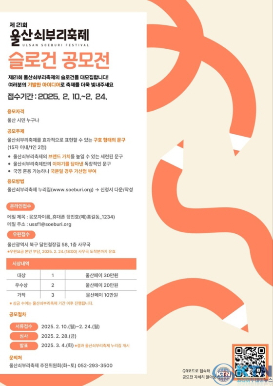 제21회 울산쇠부리축제 슬로건 공모전 (울산시민만 참여 가능) 공모분야 네이밍/슬로건 접수기간2025.02.10 ~ 2025.02.24 D+362 종료 참가자격 기타 제한 주최울산시 1등상금(상품)100만원 이하 홈페이지 바로가기 첨부파일 다운로드 유의사항 ※본 내용은 참고 자료로 내용의 오류와 변동에 대해 책임지지 않습니다. (오류 및 변동 신고는 상단의 '제안/오류' 신고를 통해 해주십시오.) ※주최사 사정에 따라 일정 및 내용이 변경될 수 있으니 주최사 홈페이지 등을 통해 관련 안내를 수시로 확인하시기 바랍니다. 상세내용 ■ 제목제21회 울산쇠부리축제 슬로건 공모전 ■ 기간 - 접수기간 : 2025.02.10 ~ 2025.2.24 - 결과발표 : 2025.03.04 ■ 참가자격 울산 시민 누구나 ■ 참여방법 / 접수방법<공모 주제> 울산쇠부리축제를 효과적으로 표현 할 수 있는 구호 형태의 문구 <제출 형식> 15자 이내/ 1인 2점으로 제한, 초과 할 경우 제출순으로 2점 접수 <접수 방법> (1) 온라인 - 울산 쇠부리축제 누리집에서 신청서 다운로드, 작성 후 이메일 제출 - 메일 제목 : 응모자 이름_휴대폰 뒷번호 예)홍길동_1234 - 이메일 주소 : ussf1@soeburi.org (2) 오프라인 - 신청서 다운로드 작성후 우편 제출 - 우편 접수처 : 울산광역시 북구 달천철장길 58 달천철장관리시설 1층 사무국 ※ 우편요금 본인 부담 / 2. 24. 도착분까지 유효 ■ 시상내용 / 혜택 - 대상 : 1명 울산페이 30만원 - 우수상 : 2명, 울산페이 20만원 - 가작 : 3명, 울산페이 10만원 ■ 유의사항유의사항 및 자세한 내용은 홈페이지 공고를 참조하세요. ■ 문의울산쇠부리축제 운영 사무국 : 052-293-3500 (화~토 09:00~18:00 / 일, 월 휴무) 목록