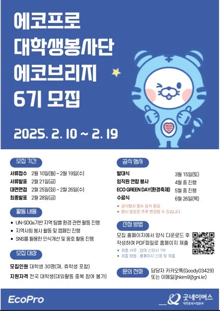 에코프로 대학생봉사단 에코브리지 6기 모집 접수기간2025.02.10 ~ 2025.02.19 D+368 종료 참가자격 대학(원)생/청년 주최에코프로 주관굿네이버스 1등상금(상품)기타 홈페이지 바로가기 첨부파일 다운로드 유의사항 ※본 내용은 참고 자료로 내용의 오류와 변동에 대해 책임지지 않습니다. (오류 및 변동 신고는 상단의 '제안/오류' 신고를 통해 해주십시오.) ※주최사 사정에 따라 일정 및 내용이 변경될 수 있으니 주최사 홈페이지 등을 통해 관련 안내를 수시로 확인하시기 바랍니다. 상세내용 ■ 제목에코프로 대학생봉사단 에코브리지 6기 모집 ■ 개요 에코프로의 대학생봉사단으로 활동하는 에코브리지는 에코프로와 지역사회를 연결하는 든든한 다리가 되어주는 역할을 합니다. 에코브리지는 지역 내 청년들이 모여 환경 이슈 해결에 중점을 두고, 지역사회에 긍정적인 변화를 만들어가는 대학생 봉사단입니다. ■ 기간 - 지원서 접수 : 2월 10일(월) ~ 2월 19일(수) - 서류발표 : 2월 21일(금) - 면접 : 2월 25일(화) ~ 2월 26일(수) - 최종발표 : 2월 28일(금) - 발대식 : 3월 15일 (토) - 임직원 연합 봉사 : 4월 중 - ECO GREEN DAY(환경축제) : 5월 중 - 수료식 : 6월 26일(목) ※ 공식행사 일정 필수 참석 ※ 행사 일정은 추후 변경될 수 있습니다. ■ 참가자격활동이 가능한 전국 대학 재학생 또는 휴학생 ■ 활동내용(1) 공통활동 - 발대식, 에코그린데이, 수료식 등 공식행사 진행 및 참석 - UN-SDGs기반 지역 팀 별 환경 관련 활동 진행(2) 팀별활동 - 지역사회 봉사 활동 및 캠페인 진행 - SNS를 활용한 인식개선 및 옹호 활동 진행 ■ 지원방법 - 모집 홈페이지에서 양식 다운로드 후 작성하여 PDF파일로 홈페이지 제출지원서 작성 후, 모집 홈페이지 통한 제출 필요 ※ 제출서류 : 참여 신청서 1부, 제안서 - 모집사이트 : https://ecobridge.recruit.roundhr.com ■ 참여 혜택 - 활동 수료 시 수료증 및 장학금 지급 - 활동비 및 교통비 지급 - 당사 입사 지원시 활동 이력 우대 - 우수 활동팀 선발 후 시상 ■ 유의사항 - 에코브리지는 활동 기간 중 타 대외활동과 병행이 불가합니다. - 지원서는 제출하게되면 내용 수정 및 반환이 불가합니다. 신중한 작성 및 지원 부탁드립니다. - 서류 합격 시 모집 사이트를 통해 개별 연락되며, 최종 선발된 봉사단은 개별 연락 및 공고를 통해 안내됩니다. - 합격자는 발대식, 수료식 외 공식행사에 필수 참여해야 하며 불참 시 합격 취소, 장학금 지원 대상 제한 등의 불이익이 발생할 수 있습니다. ■ 문의 - 모집사이트 내 Q&A를 통한 문의 - 담당자 카카오톡 : Goody03429 또는 이메일 : GN03429@gni.kr 목록