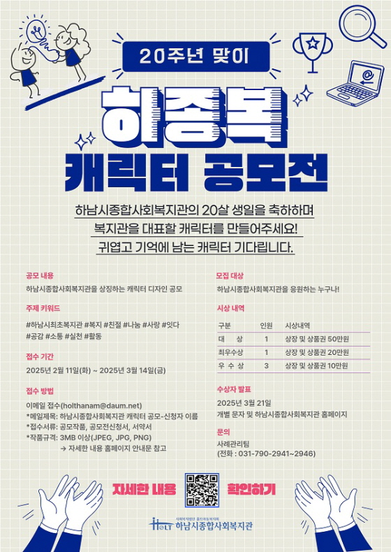 하남시종합사회복지관 개관 20주년 맞이 캐릭터 공모전 공모분야 디자인/캐릭터 접수기간2025.02.11 ~ 2025.03.14 D+345 종료 참가자격 제한없음 주최하남시종합사회복지관 1등상금(상품)100만원 이하 홈페이지 바로가기 첨부파일 다운로드 유의사항 ※본 내용은 참고 자료로 내용의 오류와 변동에 대해 책임지지 않습니다. (오류 및 변동 신고는 상단의 '제안/오류' 신고를 통해 해주십시오.) ※주최사 사정에 따라 일정 및 내용이 변경될 수 있으니 주최사 홈페이지 등을 통해 관련 안내를 수시로 확인하시기 바랍니다. 상세내용 ■ 제목하남시종합사회복지관 개관 20주년 맞이 캐릭터 공모전 ■ 기간 - 접수기간: 2025. 2. 11.(화) ~ 3. 14.(금) - 결과발표: 2025. 3. 21.(금), 홈페이지 게재 및 개별 연락 ■ 참가자격하남시종합사회복지관을 응원하는 누구나 ■ 참여방법 / 접수방법<공모주제> - 하남시종합사회복지관을 상징할 수 있는 캐릭터 디자인 공모 - 핵심키워드 #하남시 최초 복지관 #복지 #잇다 #실천 #활동 #소통 #공감 #사랑 #친절 <접수방법> 이메일 접수 holthanam@daum.net (메일제목: 하남시종합사회복지관 캐릭터 공모-신청자 이름) <제출서류> 1) 공모전 신청서 및 서약서(개인정보동의서 포함) 2) 작품파일 2개 이상(캐릭터 기본 1종 + 옆, 뒷모습 등 응용 1종 이상), 3MB 이상(JPEG, JPG, PNG) *수상작은 추후 원본파일(AI, PSD 파일) 제출필수 ■ 시상내용 / 혜택구분내용인원대상신세계상품권 50만원1명최우수상신세계상품권 20만원1명장려상신세계상품권 10만원3명 ■ 유의사항 ▪ 시상자는 복지관 공모전 시상식에 필수 참여해야 합니다. ▪ 1인 1작품만 인정되며, 타 공모전에 출품되지 않은 순수 창작물만 출품할 수 있습니다. ▪ 모방/차용 등 결격사유가 있는 작품은 심사 제외되며, 시상 이후 확인되는 경우 입상이 취소되며 상금은 반환해야 합니다. ▪ 출품된 작품은 제3자의 저작권, 초상권, 명예훼손, 지적 재산권을 침해하지 않아야 합니다. ▪ 초상권 및 저작권 등과 관련하여 민·형사상의 모든 법적 책임은 출품자에게 있습니다. ▪ 당선된 작품의 저작권 등 권리는 주최 측에 귀속되며 2차 가공 및 복지관의 비영리적 목적으로 활용될 수 있습니다. ■ 문의하남시종합사회복지관 사례관리팀 : 031-790-2941~2946 목록