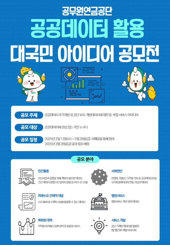 2025년 공무원연금공단 공공데이터 활용 대국민 아이디어 공모전 공모분야 기획/아이디어/마케팅 접수기간2025.02.12 ~ 2025.02.28 D+360 종료 참가자격 제한없음 주최공무원연금공단 1등상금(상품)100만원 이하 홈페이지 바로가기 첨부파일 다운로드 유의사항 ※본 내용은 참고 자료로 내용의 오류와 변동에 대해 책임지지 않습니다. (오류 및 변동 신고는 상단의 '제안/오류' 신고를 통해 해주십시오.) ※주최사 사정에 따라 일정 및 내용이 변경될 수 있으니 주최사 홈페이지 등을 통해 관련 안내를 수시로 확인하시기 바랍니다. 상세내용 ■ 제목2025년 공무원연금공단 공공데이터 활용 대국민 아이디어 공모전 ■ 기간 - 접수 : 2월 12일 ~ 2월 28일 - 결과발표 : 3월 28일 ■ 참가자격 공공데이터에 관심 있는 국민 누구나 ■ 참여방법 / 접수방법<공모 주제> 공공데이터 추가개방 및 공단보유,개방데이터에 대한 융,복합 서비스 아이디어 <공모 분야> - 민간활용 - 사회현안 - 미래수요 선제적 대응 - 행정서비스 - 특화된 대책 - 서비스 개발 <제출 형식> - 참가신청서 및 개인정보제공동의서 - 기획서 ※ 제출 양식은 홈페이지 공고문에서 다운로드 <제출처> 정보화전략실 담당자 이메일 : nhkim@geps.or.kr - 공무원연금공단 홈페이지 ‘25년 공공데이터 활용 공모전 게시글에서 제출 양식 다운로드 - 정부 공공데이터포털에 등록되어 있는 우리 공단의 공공데이터 개방 목록(홈페이지 공고문에서 다운로드 가능)을 참조하여 각 분야별 공모양식 작성 ■ 시상내용 / 혜택 - 우수 아이디어 4명 (10만원) - 우수 아이디어 포상 온누리상품권 지급 - 모든 참가자 대상 추첨을 통해 공단 기념품(에코백 등) 제공 : 30명 ※ 공단 기념품은 무작위로 제공되며 공급 상황에 따라 품목을 달리하여 제공 ■ 유의사항제출 유의사항은 홈페이지 공고글 참조 ■ 문의공무원연금공단 정보화전략실 064-802-2383 목록