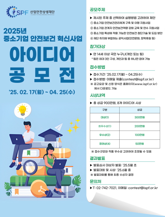 2025 중소기업 안전보건 혁신사업 아이디어 공모전 공모분야 기획/아이디어/마케팅, 정책 제안 접수기간2025.02.17 ~ 2025.04.25 D+304 종료 참가자격 제한없음 주최(재) 산업안전상생재단 1등상금(상품)200만원~499만원 홈페이지 바로가기 첨부파일 다운로드 유의사항 ※본 내용은 참고 자료로 내용의 오류와 변동에 대해 책임지지 않습니다. (오류 및 변동 신고는 상단의 '제안/오류' 신고를 통해 해주십시오.) ※주최사 사정에 따라 일정 및 내용이 변경될 수 있으니 주최사 홈페이지 등을 통해 관련 안내를 수시로 확인하시기 바랍니다. 상세내용 ■ 제목2025 중소기업 안전보건 혁신사업 아이디어 공모전 ■ 개요 산업안전상생재단(이하 ‘재단’)은 국내 중소기업의 안전역량 강화 및 중대재해 예방을 지원하고 사회 전반에 안전문화를 확산시키고자 현대자동차그룹 6개사(현대자동차, 기아차, 현대모비스, 현대건설, 현대엔지니어링, 현대제철)의 출연으로 설립된 공익재단입니다. 재단은 중소기업 맞춤형 안전보건 컨설팅을 기반으로 개선까지 실시하는 현장지원부터 교육지원, 정보지원, 장학후원 등 다방면으로 공익사업을 전개해 나가고 있습니다. 이에 재단은 더욱 내실 있는 공익사업 구상 및 추진을 위해 아래와 같이 아이디어 공모를 실시하오니 많은 관심과 적극적인 참여를 부탁드립니다. ■ 기간 - 접수기간 : ‘25. 2. 17.(월) ~ 4. 25.(금) 17:00까지 - 발표심사 및 시상 : ‘25. 6월 중 ■ 참가자격 만 14세 이상 국민 누구나(개인 또는 팀) * 팀은 최대 3인(팀장 포함) 구성, 개인과 팀 중 1개 부문만 참가 가능 ■ 참여방법 / 접수방법<공모주제>① 중소기업 안전보건관리체계 구축 및 이행을 지원하는 사업 아이디어② 중소기업 관계자의 안전보건 역량 강화를 위한 교육 및 연수 지원사업 아이디어③ 중소기업 특성에 적용 가능한 안전보건 첨단 기술 및 도입 방안④ 재단 취지에 부합하는 공익사업(장학후원, 안전문화 확산 등) 아이디어 <공모전 접수> - 제출서류 : 신청서(개인정보 수집 및 참가 동의서) 및 제안서 각 1부(붙임1 서식) - 접수방법 : 이메일(contest@ispf.or.kr) 통한 온라인 접수 ■ 시상내용 / 혜택 - 대상(1점) 300만원 - 최우수상(1점) 200만원 - 우수상(2점) 100만원 - 장려상(4점) 50만원※ 시상 내역은 접수 규모와 작품의 우수성 등을 종합 고려하여 조정될 수 있으며, 상금은제세공과금 사전 공제 후 지급 ■ 유의사항○ 개인(팀)당 1개 제안서만 응모 가능○ 기한 내에 도착하지 않은 경우와 기재된 연락처가 불분명하여 연락이 되지 않는 경우 심사에서 제외○ 단체의 경우 단체명으로 대표자에게 상금 시상○ 응모작품 수 및 응모작의 수준에 따라 시상 가감 가능○ 응모기간은 접수현황에 따라 연장 될 수 있음○ 동일 또는 유사한 응모 내용으로 2건 이상 접수되는 경우 먼저 접수된 건에 한해서 유효○ 제출된 응모작은 일체 반환하지 않으며, 입상작에 대한 권리는 전적으로 재단에 귀속○ 추후 재단에서 공익사업을 목적으로 2차 저작물을 작성할 수 있으며 홈페이지 및 전시회 등을 통해 홍보물로 배포 및 활용될 수 있음○ 저작권 등의 분쟁 발생 시 모든 법적 책임은 응모자에게 있으며, 다른 공모전 수상작품 및 타인의 창작물을 표절․복제한 경우 심사에서 제외되며, 시상 후에도 이러한 사실이 밝혀질 경우 시상을 취소하고 상금은 일체 회수○ 공고된 내용 이외의 사항은 심사위원회에서 결정 ■ 문의(재)산업안전상생재단 사무국(02-742-7021) 목록