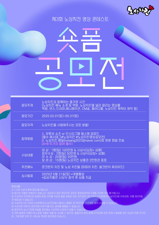 제 3회 노상치킨 영상 콘테스트 [숏폼 공모전] 공모분야 사진/영상 접수기간2025.02.01 ~ 2025.05.31 D+269 종료 참가자격 제한없음 주최노상치킨 1등상금(상품)100만원~199만원 홈페이지 바로가기 첨부파일 다운로드 유의사항 ※본 내용은 참고 자료로 내용의 오류와 변동에 대해 책임지지 않습니다. (오류 및 변동 신고는 상단의 '제안/오류' 신고를 통해 해주십시오.) ※주최사 사정에 따라 일정 및 내용이 변경될 수 있으니 주최사 홈페이지 등을 통해 관련 안내를 수시로 확인하시기 바랍니다. 상세내용 ■ 제목제 3회 노상치킨 영상 콘테스트 [숏폼 공모전] ■ 기간 - 응모기간 : 2월 1일 ~ 5월 31일 - 심사발표 : 2025년 6월 21일(토) *개별통보 ■ 참가자격 노상치킨을 사랑해주시는 모든 분들! ■ 참여방법 / 접수방법<응모주제> 노상치킨과 함께하는 즐거운 시간(노상치킨 메뉴 소개 및 먹방, 노상치킨을 널리 알리는 영상물 =먹방, 댄스,드라마,애니메이션, CM송, 패러디물, 노상치킨 캐릭터 제작 등) ※ 추천 메뉴 : 콘크런치 치킨 및 노상 치킨들 (마피아 치킨. 쌀크런치 후라이드) <응모방법>A. 유튜브/쇼츠 or 인스타그램/릴스 업로드 필수 해시태그 (#노상치킨 #노상치킨영상공모전)B. 원본 파일 이메일 제출(nosang2023@naver.com) (A+B 두가지 참여 필수) <영상 형식(파일형식 : MP4)>ㄱ.쇼츠용 영상(1분 미만의 세로형)ㄴ.로고송 ㆍ밈ㆍ 댄스 패러디 등 자유 연출 ■ 시상내용 / 혜택 - 대상: 1명(팀) 100만원 & 시상식 - 최우수상: 2명(팀) 50만원 & 시상식 - 우수상: 20명(팀) 20만원 - 장려상: 15명(팀) 노상치킨 상품권 2만원권 증정 ■ 유의사항① 1~2회 수상자 중복 참여 불가합니다.② 접수된 작품은 반환되지 않습니다. 입상하지 않은 응모작은 공모전 종료일로부터 3개월 이내에 모두 폐기됩니다.③ 수상작의 저작재산권 일체(편집 저작물 작성권 등을 포함한 모든 저작권은 (주)그레이스티앤에프(노상치킨)에 귀속되며, 이를 제3자에게 제공할 수 없습니다.④ 수상작은 (주)그레이스티앤에프(노상치킨)에서 홍보나 캠페인 등 기간 제한 없이 사용할 수 있습니다.⑤ 수상작은 이후 타 공모전에 전체 작품 또는 일부를 출품할 수 없습니다.⑥ 응모작이 심사 기준에 미달할 경우에는 수상작은 선정하지 않을 수 있습니다.⑦ 이미 발표된 작품이거나 표절 작품은 제출 및 수상할 수 없으며, 출품작의 법적 분쟁(저작권)에 관한 문제가 발생할 경우 상금은 반환 조치되며, 그에 따른 모든 민•형사상 책임은 본인에게 있습니다. 목록