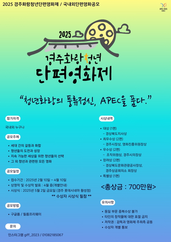 2025 경주화랑청년단편영화제 (누구나 참가 가능) 공모분야 사진/영상 접수기간2025.02.10 ~ 2025.04.10 D+320 종료 참가자격 제한없음 주최경주화랑단편영화제 1등상금(상품)200만원~499만원 홈페이지 바로가기 첨부파일 다운로드 유의사항 ※본 내용은 참고 자료로 내용의 오류와 변동에 대해 책임지지 않습니다. (오류 및 변동 신고는 상단의 '제안/오류' 신고를 통해 해주십시오.) ※주최사 사정에 따라 일정 및 내용이 변경될 수 있으니 주최사 홈페이지 등을 통해 관련 안내를 수시로 확인하시기 바랍니다. 상세내용 ■ 제목2025 경주화랑청년단편영화제 ■ 기간 - 접수기간 2025년 2월 10일 ~ 4월 10일 - 상영작 및 수상작 발표 : 4월 중(개별안내) - 시상식: 2025년 5월 2일 금요일 (경주 롯데시네마 황성점) ※ 수상자 시상식 필참 ■ 참가자격국내외 누구나 ■ 참여방법 / 접수방법<공모주제> 세대 간의 갈등과 화합 / 청년들의 도전과 성장 / 지속 가능한 세상을 위한 청년들의 선택 / 그 외 청년과 관련된 모든 영화 <공모방법>구글폼 / 필름프리웨이https://docs.google.com/forms/d/e/1FAIpQLSeeYbosRyKzJTI8409TKTwdAwDIyX8xdIDPzzFEO4-TKpcgfg/viewform ■ 시상내용 / 혜택<총상금 : 700만원> - 대상(1편) : 경상북도지사상 - 최우수상(2편) : 경주시장상, 영화진흥위원장상 - 우수상(2편) : 조직위원상, 경주시의장상 - 장려상(2편) : 경상북도문화관광공사장상, 경주상공회의소 회장상 - 특별상(1편) ■ 유의사항 - 동일 부문 중복수상 불가 - 타인의 창작물에 대한 표절 금지 - 저작권 : 감독과 영화제 주최측 공동 - 수상자 개별 통보 ※ 2023, 2024 경주화랑청년단편영화제 공식 홈페이지 : https://gjff.co.kr/ ■ 문의인스타그램 giff_2023 / 010-8218-5067 목록