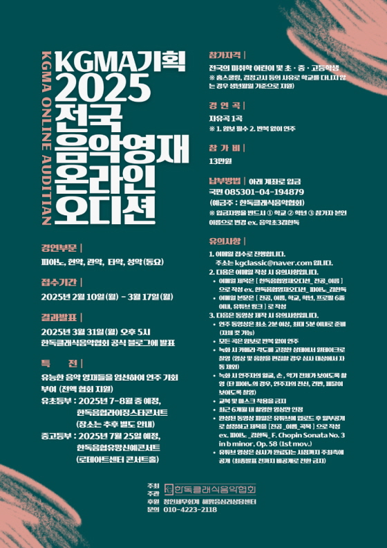 2025 전국 음악영재 온라인 오디션 공모분야 로고송/음악, 기타분야 접수기간2025.02.10 ~ 2025.03.17 D+344 종료 참가자격 청소년 주최한독클래식음악협회 1등상금(상품)기타 홈페이지 바로가기 첨부파일 다운로드 유의사항 ※본 내용은 참고 자료로 내용의 오류와 변동에 대해 책임지지 않습니다. (오류 및 변동 신고는 상단의 '제안/오류' 신고를 통해 해주십시오.) ※주최사 사정에 따라 일정 및 내용이 변경될 수 있으니 주최사 홈페이지 등을 통해 관련 안내를 수시로 확인하시기 바랍니다. 상세내용 ■ 제목2025 전국 음악영재 온라인 오디션 ■ 기간 - 신청기간 : 2025. 2.10(월) ~ 3.17(월) - 결과발표 : 2025. 3. 31(월) 오후 5시 ■ 참가자격전국의 미취학 어린이 및 초.중.고등학생(홈스쿨링, 검정고시 등의 사유로 학교를 다니지 않는 경우 생년월일 기준으로 지원) ■ 참여방법 / 접수방법<경연부문> 피아노 / 현악 / 관악 / 타악 / 성악(동요) <경연곡> 자유곡 1곡 (암보 필수 / 반복 없이 연주) <지원방법>영상촬영 -> 유튜브 업로드 -> 이메일로 접수 및 링크 첨부 (kgclassic@naver.com) * 자세한 내용은 포스터 참조 * 곡은 길어도 무방하나 영상 촬영 및 업로드는 5분이내에서 자유롭게 커트 해주시면 됩니다 <접수비> 13만원 - 입금계좌 : 국민은행 085301-04-194879 (예금주)한독클래식음악협회 ※ 입금자명을 반드시 (1) 학교 (2) 학년 (3) 참가자 본인 이름으로 변경 (예시 : 음악초3김한독) ■ 시상내용 / 혜택유능한 음악영재들을 엄선해 연주기회를 부여함(전액 협회 지원) - 유.초등부 : 2025. 7-8월 중 예정 한독음협라이징스타콘서트 (구체적인 장소 및 일시는 추후 전달) - 중.고등부 : 2025.7.25. 한독음협유망신예콘서트 (로데아트센터 콘서트홀) ■ 유의사항 홈페이지 공고, 포스터 유의사항 내용 참조 ■ 문의 한독클래식음악협회 010 4223 2118 목록