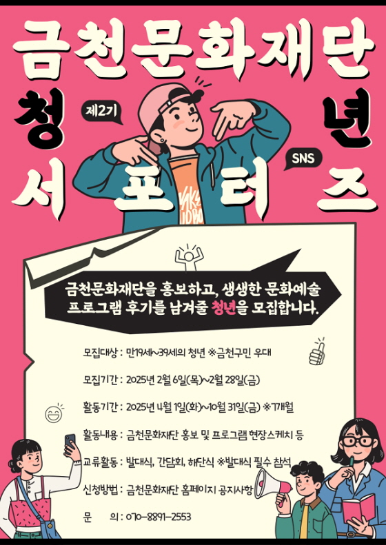 2025 금천문화재단 제2기 SNS 청년 서포터즈 모집 접수기간2025.02.06 ~ 2025.02.28 D+361 종료 참가자격 기타 제한 주최(재)금천문화재단 1등상금(상품)기타 홈페이지 바로가기 첨부파일 다운로드 유의사항 ※본 내용은 참고 자료로 내용의 오류와 변동에 대해 책임지지 않습니다. (오류 및 변동 신고는 상단의 '제안/오류' 신고를 통해 해주십시오.) ※주최사 사정에 따라 일정 및 내용이 변경될 수 있으니 주최사 홈페이지 등을 통해 관련 안내를 수시로 확인하시기 바랍니다. 상세내용 ■ 제목2025 금천문화재단 제2기 SNS 청년 서포터즈 모집 ■ 기간 - 모집기간: 2025. 2. 6.(목) ~ 2. 28.(금) - 합격자 발표일: 2025. 3. 7.(금) ※금천문화재단 홈페이지 공지※ 발대식 개최일: 2025. 3. 22.(토) (예정) 서포터즈 선정자 참석 필수 ■ 참가자격 만19세~39세의 청년 ※금천구민 우대 - (필수)금천문화재단과 문화예술에 관심이 많은 청년 - 금천구 거주 또는 직장/사업자를 보유한 사람 ■ 활동내용 금천문화재단 홍보 및 문화예술프로그램 현장스케치 등 (월 1~2회) - (홍보) 개인 SNS 계정을 활용한 홍보 - (현장스케치) 문화예술프로그램을 직접 참여하여 체험 후기 작성 ■ 지원방법이메일 제출(alice121211@gcfac.or.kr) - 제출파일명: 제2기_홍길동.hwp - (필수) 지원서 및 자기소개서, 개인정보제공동의서 - (선택사항) 금천구민, 금천구소재 직장인 증빙자료 추가 제출 <제출서류> 지원서식(붙임1-2) 각 1부, 기타 증빙자료 - (필수) 지원서식(붙임1), 개인정보제공동의서(붙임2) - (선택사항) 금천구민, 금천구소재 직장인 증빙자료 추가 제출 ※주민등록초본은 공고일 이후 발급분으로 제출(주민등록번호 뒷자리 제외하여 발급) ※금천구 소재 회사 재직증명서, 사업자등록증 등 금천구 기반 활동 증빙자료 ■ 참여 혜택 - 서포터즈 위촉장 및 수료증(조건부) 발금 - 기념품 제공 (활동 명함 및 서포터즈 굿즈 제공) - 재단 기획 공연, 전시 , 축제, 프로그램 등 초청 - 소정의 활동비 지급 ⦁ 1건 당 50,000원(월 최대 2건) ■ 유의사항 ◦ 신청 마지막 날인 2. 28.(금) 23:59까지 담당자 이메일(alice121211@gcfac.or.kr)로 제출된 서류에 한하여 접수로 인정되며, 제출한 모든 서류는 추후 반환하지 않음 ◦ 신청자의 착오, 연락 불능, 서류 미제출 등으로 발생하는 불이익은 신청자의 책임이며, 개별 심사결과는 공개하지 않음. 또한 허위⋅부정한 방법으로 지원 시 합격을 취소할 수 있음 ■ 문의070-8891-2553 (경영기획팀) ※ 누락 발생 또는 이메일주소 오기입 등의 발송오류 방지를 위해 제출 후 반드시 접수 여부 확인 부탁드립니다. 목록