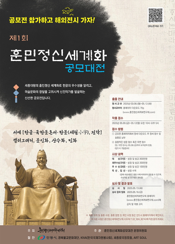 제1회 훈민정신세계화 공모대전 공모분야 웹툰/포스터/미술, 캘리그라피/서예 접수기간2025.05.09 ~ 2025.05.12 D+289 종료 참가자격 제한없음 주최훈민정신세계화연구회 1등상금(상품)200만원~499만원 홈페이지 바로가기 첨부파일 다운로드 유의사항 ※본 내용은 참고 자료로 내용의 오류와 변동에 대해 책임지지 않습니다. (오류 및 변동 신고는 상단의 '제안/오류' 신고를 통해 해주십시오.) ※주최사 사정에 따라 일정 및 내용이 변경될 수 있으니 주최사 홈페이지 등을 통해 관련 안내를 수시로 확인하시기 바랍니다. 상세내용 ■ 제목제1회 훈민정신세계화 공모대전 ■ 개요출품분야 : 서예[한글·국한문혼서·한문(세필小字), 전각], 캘리그래피, 문인화, 산수화, 민화 ■ 기간 - 방문접수 : 2025년 5월 9일(금) ~ 5월 12일(월) 오전 10:00 ~ 오후 5:00 - 우편접수 : 2025년 5월 8일(목)까지 도착분에 한함 (기일엄수) - 심사 결과발표 : 2025년 5월 16일(금) / 홈페이지에 공시 및 개별고지 - 시상식 및 개막식 안내 : 2025년 6월 10일(화) 오후 4:00 ■ 참가자격 국적과 나이 관계없음 ■ 참여방법 / 접수방법<출품수>1 ~ 3점 이내 <출품료> - 1점 50,000원 (1점 추가시 30,000원 추가) ※ 표구 : 배접하지 않고 출품해야 함 ※ 출품시 주의사항 : 1인이 각기 다른 분야에 2점 이상을 출품할 경우 원서를 분야별 따로 작성해야 함 - 계좌송금 : 농협은행, 301-0349-5886-31, 훈민정신세계화연구회 ※ 반드시 출품자 명의로 입금 <작품규격> (1) 한글, 국한문혼서, 한문, 캘리그래피, 문인화, 산수화, 민화 : 가로 70cm x 세로 135cm (전지 이내) (2) 전각 : 가로 50cm x 세로 100cm 이내 (印面印材규격은 5cm 이내), (陰刻, 陽刻의 印影과 변관 탁본(拓本)을 규격 안에 함께 나타낸 작품) (3) 세필小字 : 가로 70cm x 세로 70cm (1자 크기는 가로·세로 2.5cm 이내) <작품내용 및 유의사항> - 국내·외에 미발표한 신(新)작품 - 한국의 한글과 미술문화를 널리 세계에 알릴 수 있는 작품 - 원서에 작품의 원문을 반드시 첨부하고 출전을 기재하여야 함 <작품접수>1. 방문접수처지하철 : 4호선 성신여대역 1번 출구 직진 도보 5분버스 : 미아리고개, 미아리예술극장역 버스 (172, 103, 171, 107, 710, 102, 160, 150, 140, 143, 142) 2. 우편접수처(02817) 서울시 성북구 동소문로 181번지 성북성심빌딩 4층, 훈민정신세계화연구회본부전화 : 02-924-8274 / 담당자 : 반현종 010-2911-9570 ※ 반드시 등기우송 요함. 작품, 출품원서 ■ 시상내용 / 혜택 - 대 상 1인 : 상장 및 상금 300만원 / [세종대왕像조각작품 증정] (본 연구회로 귀속됨) - 최우수상 1인 : 상장 및 상금 200만원 / [세종대왕像조각작품 증정] (본 연구회로 귀속됨) - 우수상 3인 : 상장 및 상금 100만원 / [세종대왕像조각작품 증정] (본 연구회로 귀속됨) - 특선, 입선 : 상장 수여 <수상자 특전사항> - 수상자 작품 해외 한국문화원에서 전시예정 (한글날기념 특별전) - 초대작가 : 운영 및 심사위원 위촉 (초대작가 12점을 획득하는 자 [대상 7점, 최우수상 6점, 우수상 5점, 특선 3점, 입선 1점]) <표구> - 입선작 이상은 주최 측에서 일괄 족자 표구함 - 표구대금은 본인이 부담해야 하며 표구대금이 미납된 출품자는 낙선처리 ■ 유의사항 - 작품 반출 기간 : 낙선 및 전시작품은 규정에 따라 일괄적으로 우체국 착불 택배(수취인 비용부담)로 발송됨 ※ 택배 운송 시 파손 및 분실에 대해서 본 연구회에서 책임지지 않음 ■ 문의 기타 자세한 사항은 훈민정신세계화연구회 사무처(02-924-8274)로 문의 목록