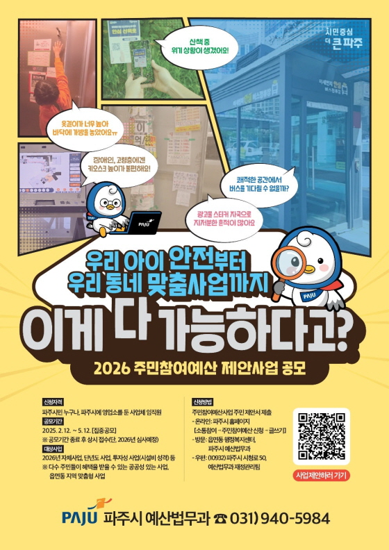 2025 파주시 주민참여예산 제안사업 공모 공모분야 기획/아이디어/마케팅, 정책 제안 접수기간2025.02.12 ~ 2025.05.12 D+289 종료 참가자격 기타 제한 주최파주시 1등상금(상품)기타 홈페이지 바로가기 첨부파일 다운로드 유의사항 ※본 내용은 참고 자료로 내용의 오류와 변동에 대해 책임지지 않습니다. (오류 및 변동 신고는 상단의 '제안/오류' 신고를 통해 해주십시오.) ※주최사 사정에 따라 일정 및 내용이 변경될 수 있으니 주최사 홈페이지 등을 통해 관련 안내를 수시로 확인하시기 바랍니다. 상세내용 ■ 제목2025 파주시 주민참여예산 제안사업 공모 ■ 기간 - 공모기간 : 2025. 2. 12.(수) ~ 5. 12.(월) [집중 공모] ※ 공모기간 종료 후 상시 접수 가능 (단, 2026년 심사 예정) ■ 참가자격 파주시민 누구나 파주시에 영업소를 둔 사업체 임직원 ■ 참여방법 / 접수방법<대상사업>2026년 자체사업 중 다수 주민들이 혜택을 받을 수 있는 공공성 있는 사업, 읍면동 지역 맞춤형 사업 등 ※ 계속 사업, 특정인에 대한 선심성 사업, 소모성·행사성 사업, 지방자치단체 사무가 아닌 사업 등 제외 <신청방법> 주민참여예산사업 제안서 제출 (양식 : 파주시 블로그 공고글에서 다운로드)▪ 방문접수 : 읍면동 행정복지센터 / 파주시청 예산법무과(본관 3층)▪ 우편접수 : (10932) 파주시 시청로 50, 예산법무과 재정관리팀(우편접수는 마감일 18:00 소인분까지 유효한 접수분으로 인정됩니다.) ※ 방문, 우편접수의 경우 파주시 블로그 공고글에서 제공하는 붙임1 서식으로 작성 ▪ 온라인접수 : 파주시 홈페이지[소통참여 - 주민참여예산 신청 – 글쓰기] ※ 홈페이지 접수의 경우 붙임2 서식으로 작성하고, 게시글 작성 시 성함, 연락처(이메일), 주소(파주시 주소) 필수 기재 ■ 문의파주시청 예산법무과 031)940-5984 목록