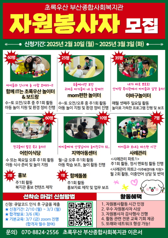 [초록우산 부산종합사회복지관] 2025년 상반기 자원봉사자 모집 접수기간2025.02.10 ~ 2025.03.03 D+359 종료 참가자격 제한없음 주최초록우산 부산종합사회복지관 1등상금(상품)기타 홈페이지 바로가기 첨부파일 다운로드 유의사항 ※본 내용은 참고 자료로 내용의 오류와 변동에 대해 책임지지 않습니다. (오류 및 변동 신고는 상단의 '제안/오류' 신고를 통해 해주십시오.) ※주최사 사정에 따라 일정 및 내용이 변경될 수 있으니 주최사 홈페이지 등을 통해 관련 안내를 수시로 확인하시기 바랍니다. 상세내용 ■ 제목[초록우산 부산종합사회복지관] 2025년 상반기 자원봉사자 모집 ■ 개요아이들을 향한 사랑과 열정이 가득한 분들이라면 누구나 환영합니다 :) ■ 기간 - 신청기간: 2025년 2월 10일 (월) ~ 2025년 3월 3일 (화) - 합격자 발표: 2025년 3월 6일 (목) * 합격자 선정을 위한 전화 연락이 있을 수 있습니다. 합격 여부는 문자로 전송될 예정입니다. - 기본교육: 2025년 3월 7일 (금) zoom 진행 (합격자 필참) ■ 참가자격- 전공무관, 아동을 사랑하고 아이들과 소통이 가능한 자- 책임감을 가지고 활동에 적극적으로 임할 수 있는 사람 ■ 활동내용[함께 IT(잇)는 초록우산 놀이터]1. 사업소개 아이들은 다양한 놀이를 경험하고, 마음껏 뛰어놀 수 있는 곳! 보호자들에게는 잠깐의 쉼을 줄 수 있는 곳! 아동을 포함한 가족 모두에게 편안한 가족 친화 공간인 '함께 IT(잇)는 초록우산 놀이터&보드랑'입니다. 2. 활동내용- 아동 놀이 지원 및 놀이 컨텐츠 구상·적용- 놀이터 교구 관리 및 놀이터 운영 보조- 보드게임 관리 및 보드랑 운영 보조, 이용자에게 보드게임 규칙 안내 3. 활동일정★ 토요일 활동 가능자 우대 ★수요일~토요일 오전(9:30~12:00) 또는 오후(13:00~17:30) 중 주1회 활동+ 2,4주 토요 운영 진행 (고정 요일제 활동이나 협의 후 조정 가능) 4. 모집인원: 60명 5. 우대사항- 전공무관, 아동을 사랑하고 아이들과 소통이 가능한 자- 책임감을 가지고 활동에 적극적으로 임할 수 있는 사람 [맘(mom)편한 놀이터]1. 사업소개 mom편한 놀이터는 영아(0-4세)전용 놀이공간으로 영아들이 주도적으로 놀이를 탐색하고 엄마-아빠들이 편안하게 육아 정보 등을 나눌 수 있는 커뮤니티형 놀이공간입니다. 2. 활동내용- 슈돌에서 볼 수 있는 귀염뽀짝한 아이들의 놀이 지원- mom편한 놀이터 교구 관리 및 정비 놀이터 운영 보조 3. 활동일정 수~토요일 오전(9시 30분~12시), 오후(13시~17시 30분) 주1회 활동*2,4주 토요일 활동 가능한자 우선 선발* / 고정 요일제 활동이나 협의 후 조정 가능 4. 모집인원: 25명 5. 우대사항- 전공무관! 아이들을 향한 사랑이 가득한 사람- 아동가족학과, 보육학과, 사회복지학과 등 아동관련 경험 전공자 우대 [이바구놀이터]1. 사업소개 놀이가 부족한 현대 아이들을 위한 맞춤형 프로그램! 산에서 복지관에서 아이들과 함께하는 특별한 순간을 만끽해보세요!2. 모집대상 아이들의 신나는 놀이활동을 짱짱한 체력으로 지원할 수 있는 적극적이고 열정적인 자원봉사자 3. 활동일정: 2024년 4월~11월 셋째주 일요일 8:30~16:30(8시간 내외)★활동 종료 시간은 월별 놀이캠프 계획 및 당일 상황에 따라 변동 가능- 시즌6(4,5,6월_총3회): 4/20, 6/22 (일) *5월 놀이캠프는 5/3 (토) 진행- 시즌7(9,10,11월_총3회): 9/21, 10/19, 11/23*활동 전 준비 자원봉사자 모집! 월 1회 평일에 활동 가능한 사람이면 더 좋아요 ♥ 4. 활동 내용 소개 아동 놀이활동 보조, 놀이 진행, 놀잇감 세팅 등 5. 우대조건- 아이들과 하루 온종일 함께 뛰어놀 수 있는 '강철체력의 소유자'- 재밌고 신선한 놀이를 추천해줄 수 있는 '창의적인 아이디어 뱅크' [어린이식당]1. 사업소개 아이들과 함께 즐겁게 놀고 맛있는 저녁식사 함께하고 싶은 사람 여기여기 모여라~! 2. 활동내용- 아동 식사 및 도시락 준비 등 어린이식당 운영 보조- 아동 놀이 및 돌봄 활동 준비&참여- 활동 종료 후 아동 관찰 내용(카카오톡 활동일지) 작성 3. 활동일정- 활동기간: 2025.04.02.(수) ~ 2025.12.04.(목) (수요일 또는 목요일 중 주1회 활동) / 7,8월은 어린이식당 휴장- 활동시간* 수요일(수정점 13:00~16:00 or 16:30~19:30 (연이어 활동도 가능) / 범일점 16:30~19:30)* 목요일(초량점 15:00~19:30 / 좌천점 16:30~19:30) 4. 활동장소- 수요일: 수정점(동구 수정공원로15), 범일점(동구 범곡로9)- 목요일: 초량점(동구 초량남로12), 좌천점(동구 증산서로 18-1) 5. 모집인원: 60명 6. 우대조건- 아이들과 놀이, 돌봄에 즐겁게 참여하고 어린이식당 운영을 보조할 수 있는 대학생(휴학생,졸업생 포함)- 어린이를 사랑하는 마음 200% 가진 자 (필수)- 아이들과 적극적으로 소통하며 놀이할 수 있는 밝은 성향- 활동 종료 시까지 책임감 있게 봉사활동에 참여할 수 있는 자 7. 어린이식당만의 특혜!- 퀄이 다른 간식 및 아이들과 함께 먹는 저녁 식사 제공 [어깨동무 수정지역아동센터]1. 사업소개 지역아동센터는 방과후 돌봄센터로, 아이들이 학습과 놀이, 식사를 하는 '집'과 같은 공간입니다. 생활 전반에 영향을 주는 곳이기 때문에 아동에게 관심이 많고선한 영향력을 줄 수 있는 분이 함께 해주시면 좋겠습니다! 2. 활동내용- 학습 보조, 놀이, 문화 활동 진행- 수학/영어 학습지