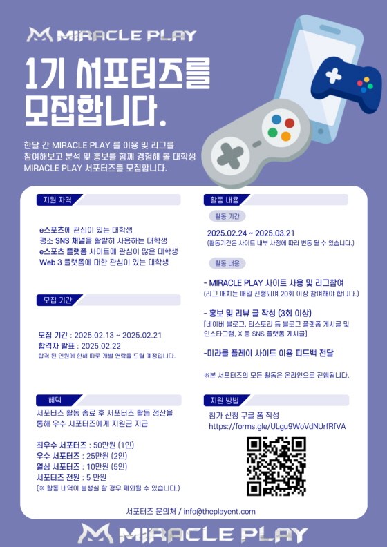 미라클 플레이 서포터즈 1기 모집 (활동 지원금 지급) 접수기간2025.02.13 ~ 2025.02.21 D+369 종료 참가자격 대학(원)생/청년 주최(주)더플레이 1등상금(상품)100만원 이하 홈페이지 바로가기 첨부파일 다운로드 유의사항 ※본 내용은 참고 자료로 내용의 오류와 변동에 대해 책임지지 않습니다. (오류 및 변동 신고는 상단의 '제안/오류' 신고를 통해 해주십시오.) ※주최사 사정에 따라 일정 및 내용이 변경될 수 있으니 주최사 홈페이지 등을 통해 관련 안내를 수시로 확인하시기 바랍니다. 상세내용 ■ 제목미라클 플레이 서포터즈 1기 모집 ■ 기간 - 모집기간 : 2025.02.13 ~ 2025.02.21 - 합격자 발표 : 2025.02.22 - 서포터즈 활동 기간 : 2025.02.24 ~ 2025.03.21 ■ 참가자격 - e스포츠에 관심이 있는 대학생 - 평소 SNS 채널을 활발히 사용하는 대학생 - e스포츠 플랫폼 사이트에 관심이 많은 대학생 ■ 활동내용 - 미라클 플레이 사이트 사용 및 리그 참여 (리그는 매일 진행되며 3주 이상 참여 필요) - 홍보 및 리뷰 글 작성 (3회 이상 / 플랫폼에 따라 상이) [블로그/ SNS 등] - 미라클 플레이 사이트 이용 피드백 전달※ 활동은 온라인으로 진행됩니다. ※ 미라클 플레이 홈페이지 : https://miracleplay.gg/ ■ 지원방법구글폼 접수https://forms.gle/8AUwQ77s1cYbKBwu9 ■ 참여 혜택 - 서포터즈 활동 종료 후 서포터즈 활동 정산을 통해 우수 서포터즈에 지원금 지급 - 최우수 서포터즈 : 50만원 - 우수 서포터즈 : 25만원 (2인) - 열심 서포터즈 : 10만원 (5인) - 서포터즈 전원 : 5만원, 활동 종료 후 수료증 발급 (활동 내역이 불성실할 경우 제외될 수 있습니다.) 목록