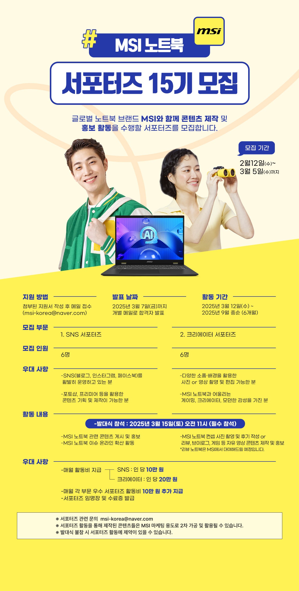 MSI 노트북 서포터즈 15기 모집 접수기간2025.02.12 ~ 2025.03.05 D+357 종료 참가자격 제한없음 주최(주) 엠에스아이코리아 1등상금(상품)기타 홈페이지 바로가기 첨부파일 다운로드 유의사항 ※본 내용은 참고 자료로 내용의 오류와 변동에 대해 책임지지 않습니다. (오류 및 변동 신고는 상단의 '제안/오류' 신고를 통해 해주십시오.) ※주최사 사정에 따라 일정 및 내용이 변경될 수 있으니 주최사 홈페이지 등을 통해 관련 안내를 수시로 확인하시기 바랍니다. 상세내용 ■ 제목MSI 노트북 서포터즈 15기 모집 ■ 개요 글로벌 노트북 브랜드 MSI와 함께할 2025 MSI 노트북 서포터즈 15기 모집이 시작되었습니다!다양한 MSI 노트북 제품에 대한 콘텐츠 제작 및 온라인 홍보 활동을 진행하오니 콘텐츠, 온라인 마케팅, 사진, 영상에 관심이 있으신 분들의 많은 지원 부탁드립니다! ■ 기간 - 모집 기간 : 2025년 2월 12일(수)~ 2025년 3월 5일(수) - 발표 날짜 : 2025년 3월 7일(금)까지 개별 메일로 합격자 발표 - 활동 기간 : 2025년 3월 12일(수) ~ 2025년 9월 중순 (6개월) ■ 참가자격우대사항 조건을 만족하는 누구나 참여 가능.<우대 사항>1. SNS 서포터즈- SNS (블로그, 인스타그램, 유튜브 등)를 활발히 운영하고 있는 분- 포토샵, 프리미어 등을 활용한 콘텐츠 기획 및 제작이 가능한 분 2. 크리에이터 서포터즈- 다양한 소품·배경을 활용한 사진or영상 촬영 및 편집이 가능한 분- MSI 노트북과 어울리는 게이밍, 크리에이터, 모던한 감성을 가진 분 3. 공통- MSI 노트북 및 IT 제품, 콘텐츠에 관심이 많으신 분 <모집 부문>1. SNS 서포터즈 6명 (예정)2. 크리에이터 서포터즈 6명 (예정) ■ 활동내용1. 발대식 참석 : 2025년 3월 15일(토) 오전 11시 (필수 참석)* 변동 가능성 有 2. SNS 서포터즈 - MSI 노트북 관련 콘텐츠 게시 및 홍보 - MSI 노트북 이슈 온라인 확산 활동 3. 크리에이터 서포터즈 - MSI 노트북 사진or영상 촬영 및 홍보 - MSI 노트북 사용 후기·영상 제작 * MSI 노트북 컨셉 사진 촬영 및 후기 작성 or 리뷰, 브이로그, 게임 등 자유 영상 콘텐츠 제작 및 홍보 * 리뷰 노트북은 MSI에서 대여해드릴 예정입니다. ■ 지원방법첨부된 지원서 작성 후 메일 접수 (msi-korea@naver.com)※ 지원서 파일 이름 : 지원서 파일명에서 제출일&이름만 변경1. SNS 서포터즈 : [SNS 서포터즈 지원서]제출일_이름(예 : [SNS 서포터즈 지원서]250212_홍길동) 2. 크리에이터 서포터즈 : [크리에이터 서포터즈 지원서]제출일_이름(예 : [크리에이터 서포터즈 지원서]250212_홍길동) ※ 지원 메일 제목1. SNS 서포터즈 : [SNS 서포터즈 지원]_이름 (예 : [SNS 서포터즈 지원]_홍길동)2. 크리에이터 서포터즈 : [크리에이터 서포터즈 지원]_이름 (예 : [크리에이터 서포터즈 지원]_홍길동) ■ 참여 혜택 - 매월 활동비 지급 *SNS 서포터즈 : 인당 10만 원 *크리에이터 서포터즈 : 인당 20만 원 - 매월 각 부문 우수 서포터즈 활동비 10만 원 추가 지급 - 서포터즈 임명장 및 수료증 발급 ■ 유의사항 - 서포터즈 활동을 통해 제작된 콘텐츠들은 MSI 마케팅 용도로 2차 가공 및 활용될 수 있습니다. - 발대식 불참 시 서포터즈 활동에 제약이 있을 수 있습니다. ■ 문의 msi-korea@naver.com 목록