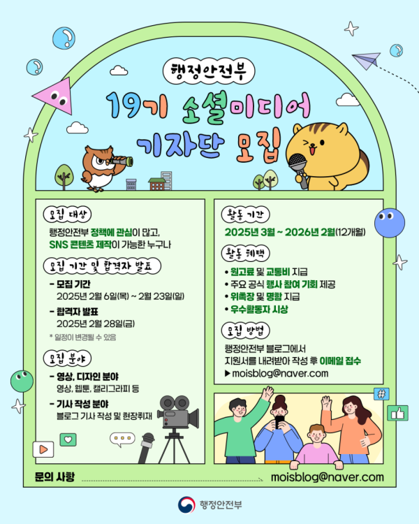 행정안전부 19기 소셜미디어 기자단 모집 접수기간2025.02.06 ~ 2025.02.23 D+367 종료 참가자격 제한없음 주최행정안전부 1등상금(상품)기타 홈페이지 바로가기 첨부파일 다운로드 유의사항 ※본 내용은 참고 자료로 내용의 오류와 변동에 대해 책임지지 않습니다. (오류 및 변동 신고는 상단의 '제안/오류' 신고를 통해 해주십시오.) ※주최사 사정에 따라 일정 및 내용이 변경될 수 있으니 주최사 홈페이지 등을 통해 관련 안내를 수시로 확인하시기 바랍니다. 상세내용 ■ 제목행정안전부 19기 소셜미디어 기자단 모집 ■ 개요행정안전부의 다양한 정책을 취재, 기사 작성, 영상 제작 등 SNS 콘텐츠로 알기 쉽게 설명해 줄 19기 소셜미디어 기자단을 모집합니다!! ■ 기간 - 모집 기간 : 2025년 2월 6일(목) ~ 2월 23일(일) - 합격자 발표 : 2025년 2월 28일(금) / 행정안전부 공식 블로그 발표 - 활동 기간 : 2025년 3월 ~ 2026년 2월(12개월) ■ 참가자격행정안전부 정책에 관심이 많고, SNS 콘텐츠 제작이 가능한 누구나 ■ 활동내용 - 영상, 디자인 분야 : 영상, 웹툰, 캘리그라피 등 - 기사 작성 분야 : 블로그 기사 작성 및 현장취재 ■ 지원방법 - 행정안전부 블로그에서 지원서를 내려받아 작성 후 이메일 접수 - 이메일 접수처 : moisblog@naver.com ※ 메일 제목과 파일명은 <행정안전부_분야_이름>으로 동일하게 작성해 주세요! (예시) 행정안전부_기사_다행이 / 행정안전부_영상_다행이 ■ 참여 혜택 - 원고료 및 교통비 지급 - 주요 공식 행사 참여 기회 제공 - 위촉장 및 명함 지급 - 우수활동자 시상 ■ 문의 moisblog@naver.com 목록
