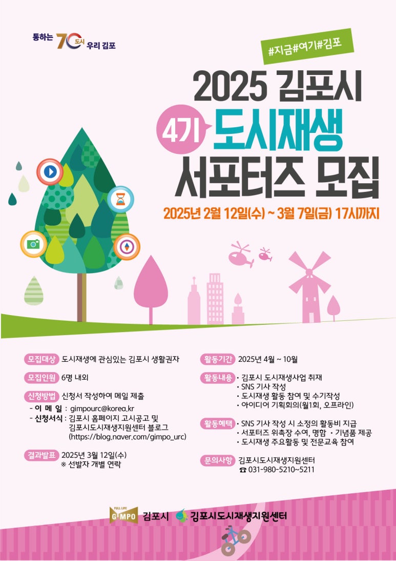 2025년 김포시 제4기 도시재생 서포터즈 모집 접수기간2025.02.12 ~ 2025.03.07 D+356 종료 참가자격 기타 제한 주최김포시 1등상금(상품)기타 홈페이지 바로가기 첨부파일 다운로드 유의사항 ※본 내용은 참고 자료로 내용의 오류와 변동에 대해 책임지지 않습니다. (오류 및 변동 신고는 상단의 '제안/오류' 신고를 통해 해주십시오.) ※주최사 사정에 따라 일정 및 내용이 변경될 수 있으니 주최사 홈페이지 등을 통해 관련 안내를 수시로 확인하시기 바랍니다. 상세내용 ■ 제목2025년 김포시 제4기 도시재생 서포터즈 모집 ■ 기간 - 접수기간 : 2025년 02월 12일(수) ~ 03월 07일(금) 17시까지 - 결과발표 : 3월 12일(수), 선발자 개별 연락 - 활동기간 : 2025년 4월 ~ 10월 ■ 참가자격 - 공고일 기준 만 19세 이상 김포시 생활권자 - 다양한 콘텐츠 제작 및 SNS 활용이 가능한 자 - 김포시 도시재생사업에 관심을 가지고 성실한 활동이 가능한 자 ※ 모집 인원 : 6명 내외 (김포시 관심도, SNS 분야 활동 경력, 콘텐츠 제작 능력, 활동 의지 등을 바탕으로 상위 점수자를 선정합니다.) ■ 활동내용도시재생에 대한 이해 및 역량강화 교육 ■ 지원방법신청서 작성 후 이메일 접수 - 이메일 접수처 : gimpourc@korea.kr ※ 신청서 작성 및 자필 서명하여 스캔본 제출 ※ 파일명 : 김포시 도시재생 서포터즈 신청서_이름.pdf - 신청서는 공식 블로그 공고글에서 다운로드 받을 수 있습니다. (공모in 본 게시글의 첨부파일을 통해서도 공고문과 신청서를 다운로드 받을 수 있습니다.) ■ 참여 혜택 - SNS기사, 콘텐츠 작성 시 소정의 활동비 지급 - 김포시 도시재생 서포터즈 위촉장 수여, 명함 및 기념품 제공 - 도시재생 주요 활동 및 전문교육 참여 ■ 유의사항 - 센터에서 진행하는 서포터즈 관련 프로그램에 적극적으로 참여하여야 하며, 센터에서 제시한 콘텐츠 주제, 제작 일정 등에 협조하여야 함 - 서포터즈가 제작한 콘텐츠는 김포시 도시재생지원센터에서 저작권을 가지며, 활동 결과물은 센터의 온‧오프라인 홍보매체를 통해 사용될 예정임 - 접수된 서류는 일절 반환하지 않으며, 제출서류에 기재된 내용이 사실과 다를 경우에는 선정이 취소될 수 있음 - 정당한 사유 없이 3개월 이상 활동 실적이 없는 경우 선정이 취소될 수 있음 ■ 문의김포시 도시재생지원센터 : 031-980-5211 목록