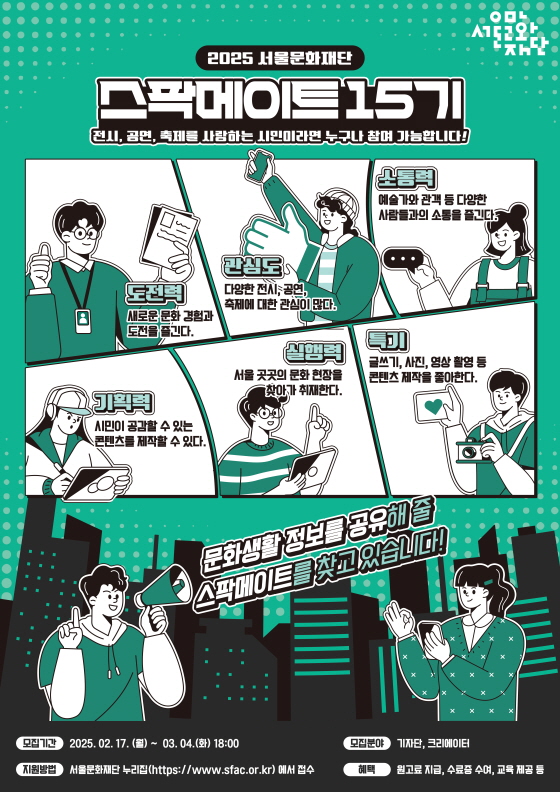 2025 서울문화재단 시민 기자 & 시민 크리에이터 15기 모집 접수기간2025.02.17 ~ 2025.03.04 D+359 종료 참가자격 제한없음 주최서울문화재단 1등상금(상품)기타 홈페이지 바로가기 첨부파일 다운로드 유의사항 ※본 내용은 참고 자료로 내용의 오류와 변동에 대해 책임지지 않습니다. (오류 및 변동 신고는 상단의 '제안/오류' 신고를 통해 해주십시오.) ※주최사 사정에 따라 일정 및 내용이 변경될 수 있으니 주최사 홈페이지 등을 통해 관련 안내를 수시로 확인하시기 바랍니다. 상세내용 ■ 제목 2025 서울문화재단 시민 기자 & 시민 크리에이터 <스팍메이트> 15기 모집 ■ 개요 서울과 문화예술을 사랑하고, 글쓰기와 영상 기획에 관심 있으신 시민 분들의 많은 참여 바랍니다. ■ 모집 분야[취재 기자단] · 뛰어난 글솜씨로 서울문화재단 문화행사 현장을 생생하게 기록해줄 기자단! → 3명 내외 모집 [콘텐츠 크리에이터] · 센스 넘치는 기획과 영상으로 서울문화재단과 시민 간의 거리를 좁혀줄 콘텐츠 크리에이터 → 3명 내외 모집 ※ 취재 기자단과 콘텐츠 크리에이터는 중복지원 불가능합니다. ■ 기간 - 모집 기간: 2025년 2월 17일(월) ~ 3월 4일(화) - 합격 발표일: 2025년 3월 14일(금) 예정 / 개별연락 예정 * 스팍메이트 15기 선발은 면접 없이 서류로만 이루어집니다. - 활동 기간: 2025년 4월 ~ 12월 ■ 참가자격 1. 문화, 예술을 사랑하고 글, 사진, 영상, 카드뉴스 등의 콘텐츠 제작 및 기획을 즐겨하시는 분 2. 서울문화재단 사업에 참가 경험이 있거나 관심이 많으신 분 3. 서울에서 열리는 축제, 공연, 전시, 교육 등 문화행사 참여 및 홍보에 “적극적이고 성실하게” 임하실 분 ■ 활동내용[공통] · 서울문화재단 공식 SNS 실시간 모니터링 · 월 1회 스팍메이트 오프라인 기획회의 참여(필수참여) [취재 기자단] · 취재기사 및 기획기사 등 월 1건 이상 기사(원고) 작성 → 서울문화재단 주최 문화행사 취재 후 기사 작성(활동 기간 중 10건 내외) [콘텐츠 크리에이터] · 숏폼 영상 위주 월 1건 이상 제작 → 서울문화재단 주최 문화행사 후기 콘텐츠 → 트렌드 중심의 챌린지 콘텐츠(활동 기간 중 10건 내외) ※ 기사와 영상은 서울문화재단 공식 블로그 및 SNS에 게재됩니다 ■ 지원방법서울문화재단 누리집(https://www.sfac.or.kr)을 통한 접수 ※ 서울문화재단 누리집 ▶ 신청·참여 ▶ 지원사업 공모 <제출 자료>[공통]1. 스팍메이트 15기 지원서 (서울문화재단 누리집 지원페이지에서 입력) [취재 기자단]1. 샘플기사 2부(*첨부파일 제출) → 교육, 공연, 전시, 포럼 등 문화예술 자유주제 기사 → 각 기사당 800자 이상 작성 필수 ※ 샘플기사에 대한 별도의 형식 없음(자유양식) ※ 샘플기사 2부는 하나의 PDF 파일로 저장 후 첨부하여 제출 (파일제목: "스팍메이트 15기 샘플기사_OOO(이름)") [콘텐츠 크리에이터]1. 직접 제작한 영상 2건 → 숏폼 1건, 자유주제 1건 총 2건의 영상 제출 → 주제 무관 → 숏폼의 경우 30초 이내, 자유 영상의 경우 길이 무관 ※ mp4나 avi 형식의 첨부파일 또는 지원서 내 링크 삽입 ※ 별도 링크나 포트폴리오가 있을 경우 첨부 가능 ■ 참여 혜택 · 서울문화재단 대표이사 활동 인증서 수여 · 서울문화재단 문화사업(공연, 전시, 축제, 교육 등) 무료 관람 및 초청 · 콘텐츠 기획·제작 관련 교육 기회 제공 · 기사 취재 건당 소정의 활동비 지원 · 서울문화재단 스팍메이트 기자증 발급 ■ 문의 서울문화재단 홍보마케팅팀(02-3290-7068) 목록