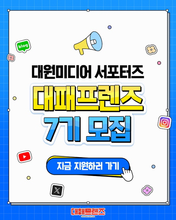 대원미디어 캐릭터 서포터즈 대패프렌즈 7기 모집 접수기간2025.02.12 ~ 2025.02.28 D+402 종료 참가자격 제한없음 주최대원미디어 1등상금(상품)기타 홈페이지 바로가기 첨부파일 다운로드 유의사항 ※본 내용은 참고 자료로 내용의 오류와 변동에 대해 책임지지 않습니다. (오류 및 변동 신고는 상단의 '제안/오류' 신고를 통해 해주십시오.) ※주최사 사정에 따라 일정 및 내용이 변경될 수 있으니 주최사 홈페이지 등을 통해 관련 안내를 수시로 확인하시기 바랍니다. 상세내용 ■ 제목대원미디어 캐릭터 서포터즈 대패프렌즈 7기 모집 ■ 개요 혹시... 캐릭터 좋아하세요?짱구, 지브리, 먼작귀, 담곰이, 도라에몽 등최애 캐릭터 덕질하면서 서포터즈 활동까지 알차게 즐길 수 있는 기회!대패프렌즈 7기와 함께해요! ■ 모집부문 - 인스타그램 부문 (10명) - 유튜브 부문 (10명) - 네이버 블로그 부문 (5명) - X(트위터) 부문 (5명) ■ 기간 - 지원 기간 : 2/12(수) ~ 2/28(금) - 서포터즈 발표 : 3/5 (수) *개별 문자 발송 - 서포터즈 발대식 : 3/7(금) 오후 2시 - 장소 : 대원미디어 콘텐츠라이브홀 - 활동 기간 : 약 8개월 (3월 ~ 11월) ■ 참가자격 - 개인 SNS 채널을 운영하는 분! - 캐릭터를 사랑하는 분 <모집 우대사항> - SNS를 활발하게 운영하시는 분 (각 부문별 기준에 따라 선발) ex) 블로그 평균 조회수 1,000회 이상이신 분 / 인스타그램 좋아요 평균 250 이상이신 분 / 유튜브 평균 조회수 3,000회 이상이신 분 / 트위터 팔로워 1만 명 이상이신 분 - 캐릭터를 사랑하며, 캐릭터 팝업스토어나 콜라보 카페 등의 방문 경험이 있으신 분 - 자신만의 콘텐츠 제작 능력이 우수하신 분 ■ 활동내용 - 기본 : 필수미션 월1회 + 선택미션 월1회 - 추가 미션 : 월 1~2회 게릴라 미션 (참여 희망 시 참여) <미션 내용> - 캐릭터 신상 굿즈 리뷰 예시) 지브리, 담곰이, 먼작귀, 도라에몽 굿즈 등등 - 대원미디어 회사 탐방하고 소개하기 - 캐릭터 전시회 및 팝업스토어 구경하고 리뷰하기 - 대원미디어 계열사 소식 홍보하기 등 ■ 지원방법 구글 폼으로 지원서 작성 : https://forms.gle/2TbUuTXhspk8r1iU6 ■ 참여 혜택 - 캐릭터 최신 굿즈 제공 - 수료시 부문별 문화상품권 지급 (10~20만원) - 대원미디어 회사 탐방 & 실무 경험 기회 제공 - 대원미디어 캐릭터 전시회 및 팝업스토어 초대 - 그 밖에 서포터즈 키트/활동 수료증 등 ■ 문의 이메일 : daewonmediaofficial@gmail.com 목록