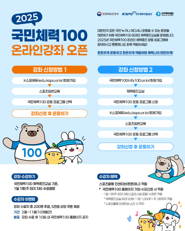2025년 국민체력100 운동프로그램 온라인 강좌 접수기간2025.02.13 ~ 2025.11.30 D+127 종료 참가자격 제한없음 주최국민체육진흥공단 주관국민체력100 후원/협찬문화체육관광부 1등상금(상품)기타 홈페이지 바로가기 첨부파일 다운로드 유의사항 ※본 내용은 참고 자료로 내용의 오류와 변동에 대해 책임지지 않습니다. (오류 및 변동 신고는 상단의 '제안/오류' 신고를 통해 해주십시오.) ※주최사 사정에 따라 일정 및 내용이 변경될 수 있으니 주최사 홈페이지 등을 통해 관련 안내를 수시로 확인하시기 바랍니다. 상세내용 ■ 제목2025년 국민체력100 운동프로그램 온라인 강좌 ■ 개요 대한민국 모든국민 누구나 어디서나 운동할 수 있는 환경을 마련하기 위해국민체력100 온라인 체력증진교실을 운영합니다!2025년 국민체력100 온라인 체력증진교실에 참여하시고 튼튼머니도 함께 적립하세요! ■ 기간2025년 2월 ~ 11월 (10개월 간) ■ 참가자격대한민국 모든 국민 ■ 활동내용온라인 강좌 신청 후 운동하기 ■ 지원방법홈페이지 공고문 참조 ■ 참여 혜택국민체력100 튼튼 머니 적립 목록