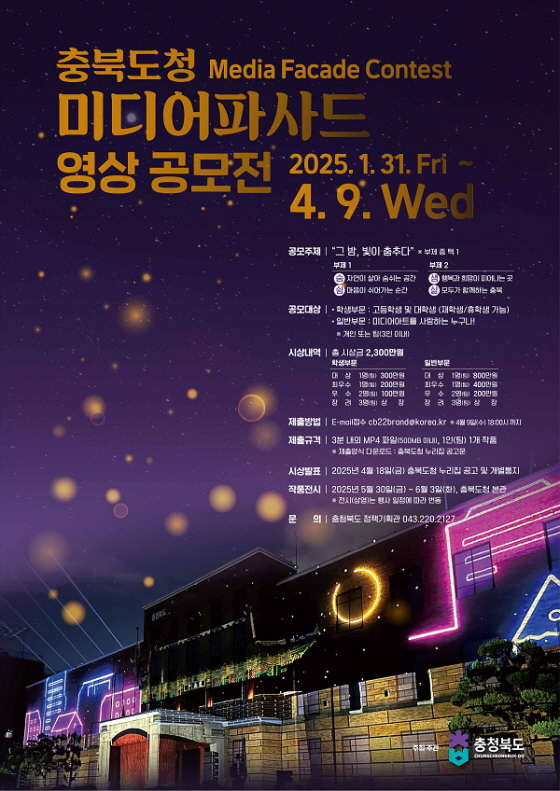 충북도청 미디어파사드 영상 공모전 공모분야 사진/영상 접수기간2025.01.31 ~ 2025.04.09 D+362 종료 참가자격 제한없음 주최충북도청 1등상금(상품)500만원~1천만원 홈페이지 바로가기 첨부파일 다운로드 유의사항 ※본 내용은 참고 자료로 내용의 오류와 변동에 대해 책임지지 않습니다. (오류 및 변동 신고는 상단의 '제안/오류' 신고를 통해 해주십시오.) ※주최사 사정에 따라 일정 및 내용이 변경될 수 있으니 주최사 홈페이지 등을 통해 관련 안내를 수시로 확인하시기 바랍니다. 상세내용 ■ 제목충북도청 미디어파사드 영상 공모전 ■ 기간 - 접수기간 : 2025.1.31.(금) ~ 4.9.(수) 18:00 까지 - 결과발표 : 2025. 4. 18.(금), 충북도청 누리집 공고 및 개별통지 - 작품전시 : 2025. 5. 30.(금) ~ 6. 3.(화) ※ 전시(상영)는 행사 일정에 따라 변동 ■ 참가자격 - 학생부 : 고등학생 및 대학생 (재학생/휴학생 가능) - 일반부 : 미디어아트를 사랑하는 누구나! ※ 개인 또는 단체(3인 이내)로 출품작 1건으로 제한 ※ 출품자격 : 타 공모전에 출품하지 않은 순수 창작물 ■ 참여방법 / 접수방법◯ 공모분야 : 미디어파사드 영상 ◯ 공모주제 : "그 밤, 빛이 춤추다”※ 부제 중 택 1 부제 1 숨 자연이 살아 숨쉬는 공간 • 숲, 바람, 공기 등 호흡을 상징하는 생동감 있는 연출 쉼 마음이 쉬어가는 순간 • 물결, 별빛, 밤하늘 등 편안한 분위기 부제 2 샘 행복과 희망이 피어나는 곳 • 꿈, 상상력, 아이디어가 샘솟는 색감과 동적인 분위기 삶 모두가 함께하는 충북 • 사람과 자연이 조화를 이루는 따뜻한 분위기 <제출방법> - 영상작품과 함께 참가신청서, 개인정보제공 동의서 제출 - E-mail접수(cb22brand@korea.kr) ※ 방문, 우편, 팩스 불가 <영상작품 제출> - 영상작품 : ‘심사용 작품’으로 공모주제 관련 미디어아트 작품 1건 ※ 수상자는 전시목적의 최종작품 제출 필수 - 제출규격 · 영상길이 : 3분 내외 (2분30초~3분30초), 1인(1팀) 1개 작품 ※ 다작품 제출시 1개 작품만 심사 · 영상비율 : 충북도청 투사 화면비율 2800*600(pixel) ※ 가이드 다운로드 : 충북도청 누리집(www.chungbuk.go.kr) 공고문 붙임 참고 · 제출양식 : MP4 파일(영상+사운드), 500MB 이내 파일 · 파 일 명 : 미디어파사드_ㅇㅇㅇ(예: 미디어파사드_김충북(팀명)) <참가서류 제출> - 공모전 참가 신청서 / 개인정보제공동의서(홈페이지 공고문에서 다운로드) ※ 신청서, 개인정보제공동의서 등 서명란은 모두 자필서명 필수 ■ 시상내용 / 혜택 총 시상금 2,300만원 + 작품전시(상영) 구 분총시상금대상(1)최우수(1)우수(2)장려(3)학생부700300200100상장일반부1,600800400200상장 ■ 유의사항 가. 응모작품은 순수 창작 작품이어야 하며, 최종 선정 이후라도 모작(위작) 등의 논란 발생 시 당선이 취소됨 나. 응모작품은 타 공모전에 수상한 작품이거나 유사 작품, 타인의 저작물 및 명의를 도용한 경우는 심사대상에서 제외되며, 선정 이후라도 발견 시 당선 취소와 시상 내역(상장·시상금)이 환수됨 다. 작품은 공공장소에 전시되는 점을 감안하여 미디어파사드 전시표출에 적합한 내용으로 제작 및 편집되어야 함 라. 지식재산권(저작권, 음원 저작권, 초상권 등)에 대한 모든 책임은 출품자(창작자)에게 있으며, 선정된 이후라도 이와 같은 책임의 문제가 발생할 경우 해당 작품의 작품제작비(창작비) 및 시상 내역(상장·시상금)이 환수됨 마. 입상하지 않은 응모작은 공모전 종료일로부터 3개월 이내에 모두 폐기함 바. 세부일정은 진행상황에 따라 변경될 수 있으며, 심사내용은 공개하지 않음 사. 상금은 소득세법 시행령 제18조에 따라 비과세 대상임 아. 응모자는 응모와 동시에 저작물 전시 및 이용을 허락한 것으로 보며, 충청북도가 공익적 목적의 전시, 홍보를 위한 영상 및 이미지 사용함을 승인함 ■ 문의 충청북도 정책기획관 기획팀 (043-220-2127) - E-mail : cb22brand@korea.kr 목록