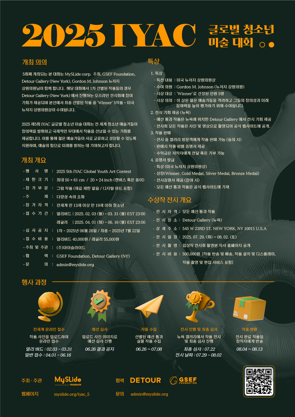 2025 제5회 IYAC 글로벌 청소년 미술 대회 (2025 5th IYAC Global Youth Art Contest) 공모분야 웹툰/포스터/미술 접수기간2025.02.03 ~ 2025.06.16 D+294 종료 참가자격 청소년 주최(주)마이슬라이드 주관(주)마이슬라이드 후원/협찬GSEF Foundation 1등상금(상품)기타 홈페이지 바로가기 첨부파일 다운로드 유의사항 ※본 내용은 참고 자료로 내용의 오류와 변동에 대해 책임지지 않습니다. (오류 및 변동 신고는 상단의 '제안/오류' 신고를 통해 해주십시오.) ※주최사 사정에 따라 일정 및 내용이 변경될 수 있으니 주최사 홈페이지 등을 통해 관련 안내를 수시로 확인하시기 바랍니다. 상세내용 ■ 제목2025 제5회 IYAC 글로벌 청소년 미술 대회 ■ 개요2025 IYAC 글로벌 청소년 미술 대회의 주제인 "다양성 속의 조화"는 차이 속에서 빛나는 조화의 아름다움을 기념합니다. 다양한 관점, 문화, 정체성을 포용함으로써 얻을 수 있는 강력함과 풍요로움을 강조합니다. 다양한 목소리와 아이디어로 가득 찬 세상 속에서, 이 주제는 청소년 예술가들에게 개개인의 다름을 인정하고 존중하면서도 조화를 이룰 수 있는 방안을 탐구하도록 도전합니다. 추상적인 표현이든 이야기 형식이든, 참가자들은 협력과 이해의 힘을 통해 더 포용적인 미래를 만들어가는 작품을 창작할 기회를 가지게 됩니다. ■ 기간 - 접수기간 (얼리버드) : 2025. 02. 03 (월) - 03. 31 (월) EST 23:00 / 40,000 원 - 접수기간 (레귤러) : 2025. 04. 01 (화) - 06. 16 (월) EST 23:00 / 55,000 원 - 참가 비용 : 얼리버드 40,000원 / 레귤러 55,000원 ※ 동일 아이디로 여러 작품 출품 가능 (1인 최대 출품 제한 없음) - 심사 결과 발표 : 1차 - 2025년 06월 26일 / 최종 - 2025년 7월 22일 ■ 참가자격 전세계 만 13세 이상 만 19세 이하 청소년 ■ 참여방법 / 접수방법참가 작품 부문 : 그림 작품 (재료 제한 없음 / 디지털 아트 포함)화지 사이즈 : 최대 50 × 61 cm / 20 × 24 인치 (캔버스 또는 종이) 주제 : 다양성 속의 조화※ 작품 제목(50자 내외)과 작품 설명 (500자 내외) 필수로 첨부 (한글 / 영문) 접수 방법 (온라인 접수) 접수 페이지로 이동 portfolioroom.org회원 가입 (※ 정확한 정보를 입력해 주세요.)공고 목록에서 ‘2025 제5회 IYAC 글로벌 청소년 미술 대회’ 페이지 접속 출품을 원하는 작품의 사진을 업로드하고 작품 관련 정보를 입력 출품 동의 사항 및 결제 진행 후 최종 제출 ■ 시상내용 / 혜택전시 참가 및 시상 총 150명 - 특상 5명 : 미국 뉴저지 상원의원상 - 전시기회 제공(뉴욕) - 작품 판매(동의 시) - 증명서 발급 (특상, 상장, 전시증명서) ■ 문의이메일 문의 : admin@myslide.org 목록