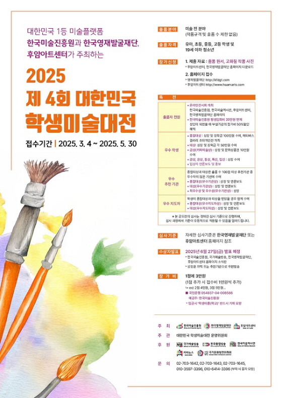 2025 제 4회 대한민국 학생미술대전 공모분야 웹툰/포스터/미술 접수기간2025.03.04 ~ 2025.05.30 D+311 종료 참가자격 청소년 주최한국미술진흥원 1등상금(상품)100만원 이하 홈페이지 바로가기 첨부파일 다운로드 유의사항 ※본 내용은 참고 자료로 내용의 오류와 변동에 대해 책임지지 않습니다. (오류 및 변동 신고는 상단의 '제안/오류' 신고를 통해 해주십시오.) ※주최사 사정에 따라 일정 및 내용이 변경될 수 있으니 주최사 홈페이지 등을 통해 관련 안내를 수시로 확인하시기 바랍니다. 상세내용 ■ 제목2025 제 4회 대한민국 학생미술대전 ■ 기간 - 접수기간 : 2025년 3월 4일 ~ 5월 30일 까지 - 결과 발표 : 2025년 6월 27일(금) 예정 ■ 참가자격 유, 초, 중, 고등학생 및 19세 이하 청소년 ■ 참여방법 / 접수방법<접수 방법> 1. 제출자료: 출품원서, 작품사진 (고품질 이미지 제출요망) - 출품원서, 공문 다운로드 : 후암아트센터, 한국영재발굴재단 홈페이지 2. 접수장소(아래 홈페이지중에서 한군데 접수) - 영재발굴재단 http://kfdgt.com / 후암아트센터 http://www.huamarts.com <참가비> - 1점에 3만원 (1점 추가 접수시 접수비 1만원 추가, 예) 2점 4만원, 3점 5만원) - 국민은행 054937-04-008566 예금주: 한국미술진흥원 <입금시 ‘학생이름(학교)’ 반드시 기재 요망> ■ 시상내용 / 혜택 1. 출품자 전원 - 온라인전시회 개최 (한국미술진흥원, 한국미술역사관, 후암아트센터, 한국영재발굴재단 홈페이지) - 한국미술진흥원 평생입회비 20만원 면제 (성인이 되었을 때 부설기관의 참가비 50%할인 혜택) 2. 우수학생 - 종합대상: 상장 및 장학금 100만원 수여, 메타버스 갤러리 초대개인전 개최 - 대상: 상장 및 장학금 각 50만원 수여 - 금상(카파미술상): 상장 및 문화상품권 10만원 수여 - 금상, 은상, 동상, 특선, 입선: 상장 수여 - 입상자 언론보도 및 홍보 3. 우수 추천기관 (종합대상과 대상은 출품 수 100점 이상 추천기관 중 우수작이 많은 기관에 수여) - 종합대상(우수기관상): 상장 및 언론보도 - 대상(우수기관상): 상장 및 언론보도 - 최우수상 및 우수상(우수기관상): 상장 4. 우수 지도자 (학생이 종합대상과 대상을 받았을 경우 함께 수여) - 종합대상(우수지도자상): 상장 및 언론보도 - 대상(우수지도자상): 상장 및 언론보도 ※ 본 공모전의 심사는 정해진 심사 기준으로 진행하며, 심사 과정에서 기준이 유동적으로 적용될 수 있음을 알려드립니다. ■ 문의 02-703-1642, 02-703-1643, 02-703-1645, 010-3597-3396, 010-6414-3396 (부재 시 문자요망) 목록