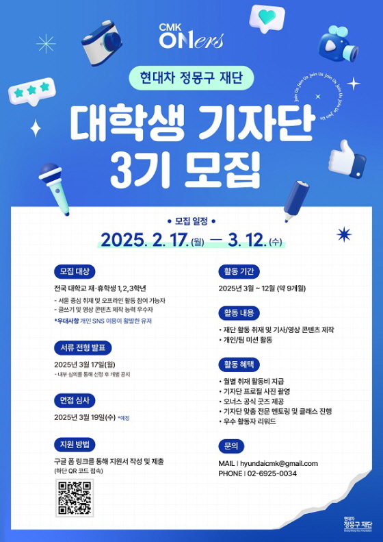 현대차 정몽구 재단 대학생 기자단(CMK ONers) 3기 모집 접수기간2025.02.17 ~ 2025.03.12 D+389 종료 참가자격 대학(원)생/청년 주최현대차 정몽구 재단 1등상금(상품)기타 홈페이지 바로가기 첨부파일 다운로드 유의사항 ※본 내용은 참고 자료로 내용의 오류와 변동에 대해 책임지지 않습니다. (오류 및 변동 신고는 상단의 '제안/오류' 신고를 통해 해주십시오.) ※주최사 사정에 따라 일정 및 내용이 변경될 수 있으니 주최사 홈페이지 등을 통해 관련 안내를 수시로 확인하시기 바랍니다. 상세내용 ■ 제목현대차 정몽구 재단 대학생 기자단(CMK ONers) 3기 모집 ■ 개요현대차 정몽구 재단에서 대학생 기자단 CMK ONers(오너스 기자단) 3기를 모집합니다.오너스 기자단은 지속가능한 미래를 위한 재단의 다양한 사업을 기자단의 시각으로보다 쉽고 친숙하게 전달하고, 현장에서 만나는 다양한 사람들의 이야기를 소개할 예정입니다.미래의 언론인과 홍보인을 꿈꾸는 대학생 여러분의 많은 관심과 지원을 기다립니다. ■ 기간- 모집 일정: 2025년 2월 17일(월) ~ 3월 12일(수) - 서류 전형 발표: 2025년 3월 17일(월), 내부 심의를 통해 선정 후 개별 공지- 면접 심사: 2025년 3월 19일(수) 예정- 활동 기간 : 2025년 4월 ~ 12월 (약 9개월) ■ 참가자격전국 대학교 재•휴학생 1, 2, 3학년- 서울 중심 취재 및 오프라인 활동 참여 가능자- 글쓰기 및 영상 콘텐츠 제작 능력 우수자- 우대사항: 개인 SNS 이용히 활발한 유저 ■ 활동내용- 재단 활동 취재 및 기사/영상 콘텐츠 제작- 개인/팀 미션 활동 ■ 지원방법- '구글 폼’ 링크를 통해 지원서 작성 및 제출- 지원하기: https://forms.gle/jWBrN4KYcTDiVDWy6 ■ 참여 혜택- 월별 취재 활동비 지급 - 기자단 프로필 사진 촬영- 오너스 공식 굿즈 제공 - 기자단 맞춤 전문 멘토링 및 클래스 진행- 우수 활동자 리워드 ■ 문의- 메일 hyundaicmk@gmail.com- 전화 02-6925-0034 목록