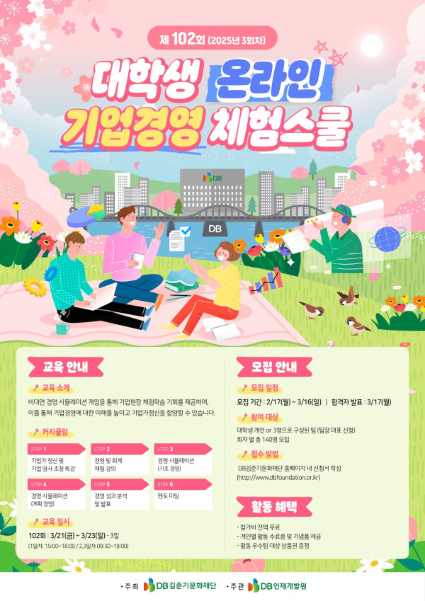 제102회 대학생 온라인 기업경영 체험스쿨 참가자 모집 접수기간2025.02.17 ~ 2025.03.16 D+385 종료 참가자격 대학(원)생/청년 주최DB김준기문화재단 1등상금(상품)기타 홈페이지 바로가기 첨부파일 다운로드 유의사항 ※본 내용은 참고 자료로 내용의 오류와 변동에 대해 책임지지 않습니다. (오류 및 변동 신고는 상단의 '제안/오류' 신고를 통해 해주십시오.) ※주최사 사정에 따라 일정 및 내용이 변경될 수 있으니 주최사 홈페이지 등을 통해 관련 안내를 수시로 확인하시기 바랍니다. 상세내용 ■ 제목제102회 대학생 온라인 기업경영 체험스쿨 참가자 모집 ■ 개요비대면 경영 시뮬레이션 게임을 통해 기업현장 체험학습 기회를 제공하며,이를 통해 기업경영에 대한 이해를 높이고 기업가 정신을 함양할 수 있습니다. ■ 기간 - 접수 기간 : 2025년 2월 17일(월) ~ 3월 16일(일) - 합격자 발표 : 3월 17일(월) - 102회 교육 일시 : 3월 21일(금) ~ 3월 23일(일) 3일간 ※ 1일차 : 15:00~18:00 / 2,3일차 : 09:30~18:00 ■ 참가자격 - 대학생 개인 또는 3명으로 구성된 팀 (팀장 대표 신청) - 회차별 총 140명 모집 ■ 커리큘럼 특강, 강의, 경영 시뮬레이션, 멘토 미팅 등 ■ 지원방법DB김준기문화재단 홈페이지 내 신청서 작성https://www.dbfoundation.or.kr/news/notice_view?seqId=10006448&pageIndex=1&searchSelectType1=&searchText= ■ 참여 혜택 - 참가비 전액 무료 - 개인별 활동 수료증 및 기념품 제공 - 활동 우수팀 대상 상품권 증정 ■ 문의 전화 : 02-3011-5544 / 이메일 : intern@dbgroup.co.kr 목록