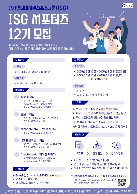 인터내셔널스포츠그룹 ISG 서포터즈 12기 모집 접수기간2025.02.15 ~ 2025.03.06 D+394 종료 참가자격 대학(원)생/청년 주최(주)인터내셔널스포츠그룹 1등상금(상품)기타 홈페이지 바로가기 첨부파일 다운로드 유의사항 ※본 내용은 참고 자료로 내용의 오류와 변동에 대해 책임지지 않습니다. (오류 및 변동 신고는 상단의 '제안/오류' 신고를 통해 해주십시오.) ※주최사 사정에 따라 일정 및 내용이 변경될 수 있으니 주최사 홈페이지 등을 통해 관련 안내를 수시로 확인하시기 바랍니다. 상세내용 ■ 제목인터내셔널스포츠그룹 ISG 서포터즈 12기 모집 ■ 개요㈜인터내셔널스포츠그룹(이하 ISG)과 (사)한국코칭능력개발원(이하 KCDC)에서 미래 스포츠산업 종사자들을 위한 서포터즈를 모집합니다. ■ 기간 - 모집 기간 : 25. 02. 15. ~ 25. 03. 06. 이후 전화 면접 후 결정 - 활동기간 및 활동유형 • 2025년 3월 10일 ~ 2025년 8월 31일(6개월) / 2025년 3월 10일 ~ 2026년 2월 28일(1년) (둘 중에 하나 선택) • 비대면 • 최소 주 5시간 이상 업무 진행 - 합격자 OT : 25년 3월 10일(월) 저녁 8-9시(비대면) ■ 참가자격 전국 대학교 재 · 휴학생 / 대학원생 ■ 활동내용홍보 제작팀• ISG 인스타그램 카드뉴스 제작• KCDC 민간자격증 홍보물 제작• ISG & KCDC 프로그램 텔레마케팅 홍보 기획팀• ISG 인스타그램 카드뉴스 컨텐츠 기획• ISG & KCDC 홍보 기획 숏폼영상제작자, 유튜버 제작자• ISG & KCDC 프로그램 영상 제작 ISG 프로젝트 기획팀• KCDC 스포츠아카데미 창단 및 회원모집• ISG & KCDC 프로젝트 기획 Coach-Leader 매거진 제작자• 한국코칭능력개발원에서 발행하는 “Coach-Leader” 매거진 제작 ■ 지원방법• E-mail 접수 : yhjhc9901@naver.com- 접수서류: 지원신청서- 포트폴리오 제출 시 가산점 부여 ■ 참여 혜택1. 서포터즈 전원 ISG 서포터즈 수료증 발급2. 서포터즈 전원 스포츠마케팅전문가 자격증 발급3. 우수 서포터즈를 선정하여 인센티브(다른 자격증 발급 및 1년 수료자에 한하여 능력이 탁월한 서포터즈는 대표와 논의해서 ISG & KCDC 운영 참여) 제공 ■ 문의 담당자 : 010-4604-8286 목록