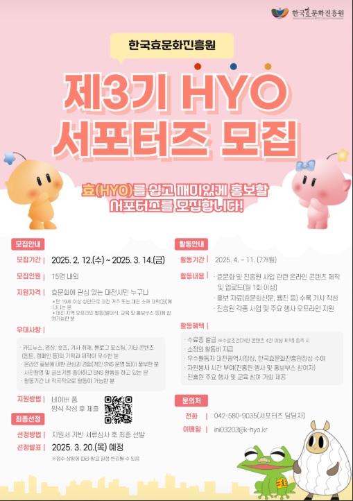 효문화진흥원 2025 제3기 HYO 서포터즈 모집 접수기간2025.02.12 ~ 2025.03.14 D+387 종료 참가자격 지역한정 주최한국효문화진흥원 1등상금(상품)기타 홈페이지 바로가기 첨부파일 다운로드 유의사항 ※본 내용은 참고 자료로 내용의 오류와 변동에 대해 책임지지 않습니다. (오류 및 변동 신고는 상단의 '제안/오류' 신고를 통해 해주십시오.) ※주최사 사정에 따라 일정 및 내용이 변경될 수 있으니 주최사 홈페이지 등을 통해 관련 안내를 수시로 확인하시기 바랍니다. 상세내용 ■ 제목 효문화진흥원 2025 제3기 HYO 서포터즈 모집 ■ 기간 - 모집기간 : 2025. 2. 12.(수) ~ 3. 14.(금) ※ 마감일 까지 18:00 ※ 모집인원 : 15명 내외 - 활동기간 : 2025. 4 ~ 10월 / 7개월 - 선정발표 : 2025. 3. 20. (목) 예정 / 홈페이지 게시 및 개별 통보 ■ 참가자격효문화에 관심 있는 대전시민 누구나 * 만 19세 이상 성인(대학생 주부 프리랜서 등) 으로 대전 거주 또는 대전 소재 대학(원)에 다니는 사람 대전에서 활동할 수 있는 사람(발대식 오프라인 부스 활동 수료식 등 각종 행사 대전에서 진행) <우대사항> - 카드뉴스 영상 숏츠 기사 취재 블로그 포스팅 기타 콘텐츠(웹툰 캠페인 등)의 기획과 제작이 우수한 사람 - 온라인 홍보에 대한 관심과 경험(개인 SNS 운영 등)이 풍부한 사람 - 사진촬영 및 글쓰기를 좋아하고 SNS 활동을 적극적으로 하고 있는 사람 - 활동기간 내 적극적으로 활동이 가능한 사람 ■ 활동내용 - 효문화 및 진흥원 홍보 관련 온라인 콘텐츠 제작 및 업로드 (월 1회 이상) - 진흥원 홍보 자료(효문화신문, 웹진 등) 수록 기사 작성 - 진흥원 각종 사업 및 주요 행사(연수 포럼, 홍보부스 운영 등) 취재지원 ■ 지원방법 - 한국효문화진흥원 공식 내 모집 게시물 공고 확인 - 네이버 폼 신청 접수 : https://naver.me/G4WS59Ih ■ 참여 혜택 - 수료증 발급 ※수료조건 (개인 콘텐츠 제작 4건 이상 제작) 미달 시 발급 불가 - 소정의 활동비 지급 - 우수활동자 대전광역시장상, 한국효문화진흥원장상 수여 - 자원봉사 시간 부여 (부스운영 등 진흥원 행사 봉사지원 참여자) - 진흥원 주요 행사 및 교육 참여 기회 제공 (콘텐츠 제작 교육, 효 교육 등) ■ 유의사항 - 선발된 서포터즈는 발대식 및 해단식 , 필수 참석으로 참석 불가 시 최종 선발 취소 사유가 될 수 있습니다. - 부정한 방법으로 제출 서류의 전체 또는 일부를 위조 및 변조하거나 허위로 기재한 경우 선발이 취소됩니다. - 제출 서류의 기재 착오 또는 누락이나 연락 불능으로 인한 불이익은 제출자 본인의 책임이며 제출된 서류는 일체 반환하지 않습니다. ■ 문의한국효문화진흥원 서포터즈 담당자 - 전화 : 042-580-9035 - 이메일 : ini03203@k-hyo.kr - 운영시간 : 월~금 9:00 ~ 18:00 (점심시간 12:00 ~ 13:00) 목록
