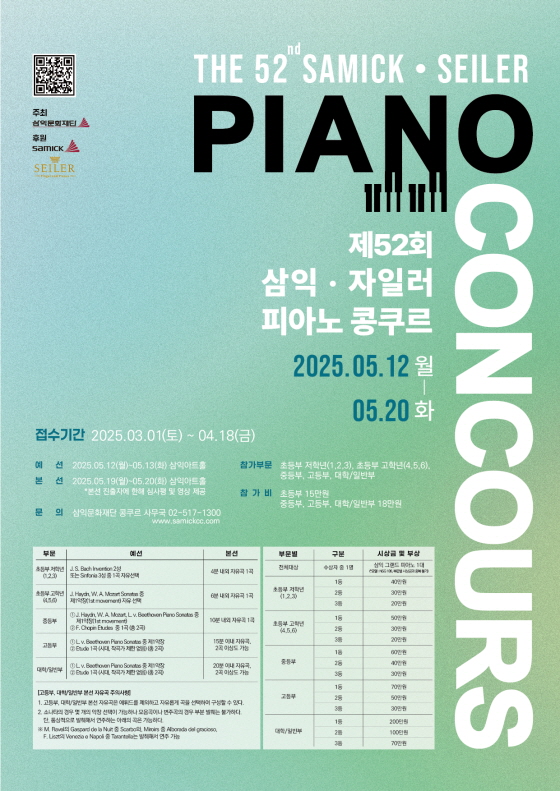 제52회 삼익·자일러 피아노 콩쿠르 접수기간2025.03.01 ~ 2025.04.18 D+353 종료 참가자격 제한없음 주최삼익문화재단 1등상금(상품)200만원~499만원 홈페이지 바로가기 첨부파일 다운로드 유의사항 ※본 내용은 참고 자료로 내용의 오류와 변동에 대해 책임지지 않습니다. (오류 및 변동 신고는 상단의 '제안/오류' 신고를 통해 해주십시오.) ※주최사 사정에 따라 일정 및 내용이 변경될 수 있으니 주최사 홈페이지 등을 통해 관련 안내를 수시로 확인하시기 바랍니다. 상세내용 ■ 제목제52회 삼익·자일러 피아노 콩쿠르 ■ 개요문화 예술적 가치를 실현하고 선도하는 삼익문화재단에서는 올해 ‘제52회 삼익·자일러 피아노 콩쿠르’를 개최합니다.대한민국을 대표하는 피아노 콩쿠르로서 피아니스트의 첫 등용문이며 세계 무대로 나아갈 피아니스트들의 장이 될 것입니다. 참가자분들의 많은 관심과 성원을 부탁드리며이번 ‘삼익·자일러 피아노 콩쿠르’를 통해 여러분의 꿈이 한 걸음 더 나아가길 기원합니다. ■ 기간 - 접수기간 2025년 3월 1일(토)~4월 18일(금) 까지 - 예선 : 2025년 5월 12일(월) ~ 13일(화) 삼익아트홀 - 본선 : 2025년 5월 19일(월) ~ 20일(화) 삼익아트홀 ■ 참가자격<참가부문>초등부 저학년(1,2,3), 초등부 고학년(4,5,6), 중등부, 고등부, 대학/일반부 <참가 자격>1) 초등부, 중등부, 고등부의 경우 재학생 및 이외 동등한 학력의 소유자, 재수생의 경우 대학/일반부로 편성2) 초, 중, 고등학교 졸업자는 중, 고, 대/일반부에 각각 지원해야 함3) 참가자 기준은 재학 여부, 졸업 여부, 생년월일 순으로 우선적용 함4) 재학생일 경우 생년월일에 관계없이 2025년 현재 재학 기준5) 휴학생 및 홈스쿨링 등으로 학교를 다니지 않을 경우 생년월일 기준에 따라 지원 가능 -2016년 1월 1일 이후 ~ 2018년 12월 31일 이전 출생자 - 초등부 저학년(1,2,3) -2013년 1월 1일 이후 ~ 2015년 12월 31일 이전 출생자 - 초등부 고학년(4,5,6) -2010년 1월 1일 이후 ~ 2012년 12월 31일 이전 출생자 - 중등부 -2007년 1월 1일 이후 ~ 2009년 12월 31일 이전 출생자 - 고등부 -1990년 1월 1일 이후 ~ 2006년 12월 31일 이전 출생자 - 대학/일반부6) 검정고시를 통해 초·중·고등학교 졸업학력을 취득했더라도 상급학교에 진학하지 않았다면 위 생년월일 기준 규정에 따라 지원해야 함7) 해외 국제 학교 재학중인 참가자의 경우 생년월일 기준으로 지원해야 함 ■ 참가비 - 초등부 15만원 - 중등부, 고등부, 대학/일반부 18만원 ■ 지원방법 홈페이지 접수 www.samickcc.com ■ 참여 혜택 - 전체 대상 : 삼익 그랜드 피아노 1대 - 일반부 대상 200만원 등 다수 시상 ■ 유의사항 - 예선, 본선 연주곡은 충분히 심사하였다고 판단된 경우 중간에 곡을 끊을 수 있음 - 모든 일정은 홈페이지를 통해 공지되며, 모든 참가자는 사무국의 공지에 따라 일정에 차질 없이 참가해야 함 - 모든 참가자는 반복 없이 암보로 연주하며, 통례상 반복되는 것은 허용함 - 예선, 본선 곡은 중복 불가함 - 대회 운영상 일정 및 시상내역은 변동될 수 있음 - 참가 신청서에 허위사실을 기재하였을 경우 입상이 취소될 수 있음 ■ 문의삼익문화재단 콩쿠르 사무국 02-517-1300 목록