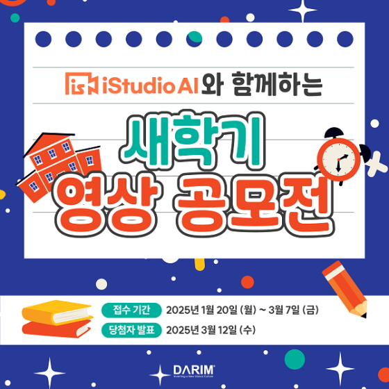 iStudio AI와 함께하는 새학기 영상 공모전 공모분야 사진/영상 접수기간2025.01.20 ~ 2025.03.07 D+395 종료 참가자격 제한없음 주최다림시스템 1등상금(상품)기타 홈페이지 바로가기 첨부파일 다운로드 유의사항 ※본 내용은 참고 자료로 내용의 오류와 변동에 대해 책임지지 않습니다. (오류 및 변동 신고는 상단의 '제안/오류' 신고를 통해 해주십시오.) ※주최사 사정에 따라 일정 및 내용이 변경될 수 있으니 주최사 홈페이지 등을 통해 관련 안내를 수시로 확인하시기 바랍니다. 상세내용 ■ 제목iStudio AI와 함께하는 새학기 영상 공모전 ■ 기간 - 접수기간 : 2025년 1월 20일 (월) ~ 2025년 3월 7일 (금) - 결과발표 : 2025년 3월 12일 / 다림시스템 블로그에서 결과 발표 ■ 참가자격 초, 중, 고, 대학생 및 선생님, 교수님 등 새학기를 맞이하는 누구나 참여 가능합니다. ■ 참여방법 / 접수방법<공모 주제> 당신의 아이디어를 마음껏 펼칠 수 있는 기회!iStudio AI의 가상스튜디오 기술을 사용하여 영상을 자유롭게 만들어주세요!연극, 발표, 노래, 춤, 강의, 그림 그리기 등 좋아하는 어떤 것이든 촬영해도 괜찮습니다! <제출 형식> - iStudio AI로 녹화하여 만든 영상 (MP4 파일 형식) - 영상 길이는 30초에서 3분 사이로 제한 <접수 방법> 1. 다운로드 링크를 클릭하여 iStudio AI 체험판을 다운로드 한다. (iStudio AI는 Window 기반 컴퓨터에서 가능합니다.) - 다운로드 링크 : https://www.darim.co.kr/istudio-free-download 2. iStudio AI를 설치하고 실행하여 재미있게 영상을 녹화한다. - iStudio AI 설치 방법 : https://blog.naver.com/darim_istudio/223728771426 ※ 체험판은 10분동안 사용 가능하며, 10분이 지난 후에는 화면에 마크가 나타납니다. 종료 후 다시 실행하면 마크 없이 10분간 사용이 가능합니다. 3. 아래 양식으로 내용을 작성하고 영상을 첨부하여 taeyang@darim.com으로 이메일을 보낸다. - 이메일 양식 이름 또는 닉네임 : 나이 : 소속 : 연락처 : 간단한 영상 설명 : ■ 시상내용 / 혜택 - 대상 (1명) : 월 20만원 상당의 iStudio AI 3년 무료 이용권, 10만원 상당의 SONY 무선 헤드셋 - 최우수상 (1명) : 월 20만원 상당의 iStudio AI 2년 무료 이용권, 3만원 상당의 치킨 기프티콘 - 우수상 (2명) : 월 20만원 상당의 iStudio AI 1년 무료 이용권, 3만원 상당의 치킨 기프티콘 ■ 유의사항 제출된 영상의 저작권은 제작자에게 있으나, 공모전에 제출된 모든 영상은 iStudio AI의 홍보 및 마케팅 목적으로 활용될 수 있습니다. 제출 시, 아래 사항에 동의하신 것으로 간주됩니다.1. 영상 활용 범위 - 다림시스템의 공식 웹사이트, SNS 채널, 프로모션 영상 등 다양한 홍보 콘텐츠에 사용될 수 있습니다. - 필요한 경우, 일부 편집 후 사용될 수 있습니다.2. 개인정보 제공 및 활용 - 경품 수령을 위해 제공된 개인정보(연락처 등)는 경품 발송과 관련된 용도로만 사용됩니다. - 공모전 참가 시, 개인정보 제공에 동의한 것으로 간주되며, 경품 수령을 위한 최소한의 정보가 필요합니다. - 수집된 개인정보는 경품 발송 완료 후 즉시 파기됩니다.3. 제작자 정보 명시 - 홍보 콘텐츠 활용 시, 제작자의 이름(닉네임), 나이 또는 소속 등 크레딧이 함께 제공됩니다.<참여시 유의사항> - 잘못된 개인정보로 인하여 연락이 닿지 않을 경우 수상이 취소됩니다. - 부정행위(예: 타인의 영상을 도용하거나, 부적절한 내용을 포함하는 경우)가 발견되면 참여가 무효화됩니다. - 이벤트 관련 추가 공지나 변경사항은 블로그를 통해 전달됩니다. ■ 문의 www.darim.co.kr 목록