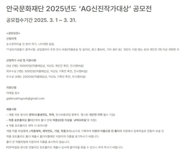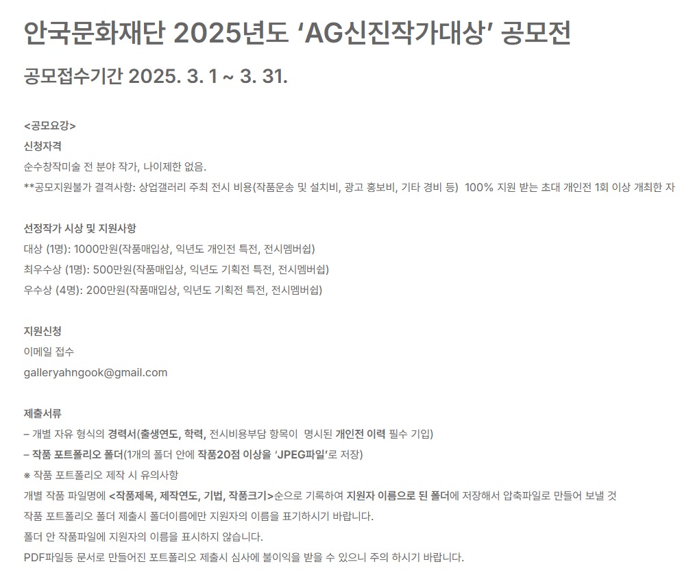 안국문화재단 2025년도 ‘AG신진작가대상’ 공모전 공모분야 웹툰/포스터/미술 접수기간2025.03.01 ~ 2025.03.31 D+371 종료 참가자격 제한없음, 기타 제한 주최안국문화재단 1등상금(상품)500만원~1천만원 홈페이지 바로가기 첨부파일 다운로드 유의사항 ※본 내용은 참고 자료로 내용의 오류와 변동에 대해 책임지지 않습니다. (오류 및 변동 신고는 상단의 '제안/오류' 신고를 통해 해주십시오.) ※주최사 사정에 따라 일정 및 내용이 변경될 수 있으니 주최사 홈페이지 등을 통해 관련 안내를 수시로 확인하시기 바랍니다. 상세내용 ■ 제목안국문화재단 2025년도 ‘AG신진작가대상’ 공모전 ■ 기간 - 공모접수기간 2025. 3. 1 ~ 3. 31. - 결과발표 및 시상식 : 5월 중 안국문화재단 홈페이지 게시 및 수상자 개별 통보 - 선정작가 전시 : 2025년 5월 12일~7월 2일 / 안국문화재단 AG갤러리 ■ 참가자격 순수창작미술 전 분야 작가, 나이제한 없음.** 공모지원불가 결격사항: 상업갤러리 주최 전시 비용(작품운송 및 설치비, 광고 홍보비, 기타 경비 등) 100% 지원 받는 초대 개인전 1회 이상 개최한 자 ■ 참여방법 / 접수방법<제출서류> – 개별 자유 형식의 경력서(출생연도, 학력, 전시비용부담 항목이 명시된 개인전 이력 필수 기입) – 작품 포트폴리오 폴더(1개의 폴더 안에 작품20점 이상을 ‘JPEG파일’로 저장) ※ 작품 포트폴리오 제작 시 유의사항 개별 작품 파일명에 <작품제목, 제작연도, 기법, 작품크기>순으로 기록하여 지원자 이름으로 된 폴더에 저장해서 압축파일로 만들어 보낼 것작품 포트폴리오 폴더 제출시 폴더이름에만 지원자의 이름을 표기하시기 바랍니다.폴더 안 작품파일에 지원자의 이름을 표시하지 않습니다.PDF파일등 문서로 만들어진 포트폴리오 제출시 심사에 불이익을 받을 수 있으니 주의 하시기 바랍니다. <지원신청>이메일 접수 : galleryahngook@gmail.com <심사방법>1차 지원서류 결격사항 심사2차 포트폴리오 심사 후 6명 선정작가 선발3차 선정작가 전시 중 출품된 전시 작품을 심사하여 최종 입상자 선정 ■ 시상내용 / 혜택 - 대상 (1명): 1000만원(작품매입상, 익년도 개인전 특전, 전시멤버쉽) - 최우수상 (1명): 500만원(작품매입상, 익년도 기획전 특전, 전시멤버쉽) - 우수상 (4명): 200만원(작품매입상, 익년도 기획전 특전, 전시멤버쉽) 목록