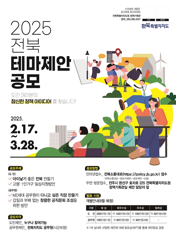 2025년 전북특별자치도 도민·공무원 테마제안 공모 공모분야 기획/아이디어/마케팅, 정책 제안 접수기간2025.02.17 ~ 2025.03.28 D+374 종료 참가자격 제한없음, 기타 제한 주최전북특별자치도청 1등상금(상품)200만원~499만원 홈페이지 바로가기 첨부파일 다운로드 유의사항 ※본 내용은 참고 자료로 내용의 오류와 변동에 대해 책임지지 않습니다. (오류 및 변동 신고는 상단의 '제안/오류' 신고를 통해 해주십시오.) ※주최사 사정에 따라 일정 및 내용이 변경될 수 있으니 주최사 홈페이지 등을 통해 관련 안내를 수시로 확인하시기 바랍니다. 상세내용 ■ 제목2025년 전북특별자치도 도민·공무원 테마제안 공모 ■ 기간공모기간 : 2024. 2. 17.(월) ~ 3. 28.(금) 18:00까지 ■ 참가자격(도민제안) 누구나 참여가능 (공무원제안) 전북특별자치도 공무원(시군포함) ■ 참여방법 / 접수방법<공모주제>도민 : 아이 낳기 좋은 전북 만들기 / 고령, 1인가구 일상 지원 방안 공무원 : MZ세대 공무원이 다니고 싶은 직장 만들기 / 갑질과 부패 없는 청렴한 공직문화 조성을 위한 방안 <응모방법> ◯ 작성서식: 공모 제안서 1부(붙임 양식) ◯ 제출수량: A4용지 1∼2매 정도 ◯ 제출방법: 온라인, 우편 또는 방문 ① 온라인: 전북소통대로(https://policy.jb.go.kr) 접수 -(도민) 전북소통대로‣공모/이벤트‣공모제안‣신청(도민제안 서식 작성) -(공무원) 전북소통대로‣공모/이벤트‣공모제안‣신청(공무원제안 서식 작성) ② 우편 또는 방문접수 ※ 우편: 전주시 완산구 효자로 225 전북특별자치도청(정책기획관실) 제안담당자 앞 * 온라인, 방문접수는 접수마감일 18:00 도착분, 우편은 접수마감일 소인분 ■ 시상내용 / 혜택 ◯ 본 심 사: 제안자 발표심사 등을 통해 수상등급 결정* * 발표심사 대상자 6월 안내, 발표(5분 이내)에 필요한 PPT 자료 및 기타 자료 준비 ◯ 시상내역 구분대상최우수상우수상장려상도민200만원(1명) 각 150만원(2명)각 100만원(3명)각 50만원(4명)공무원100만원(1명)각 60만원(3명)각 30만원(4명)- ■ 유의사항 ❍ 제출된 제안서 및 관련 서류는 선정 여부를 불문하고 반환하지 않음 ❍ 응모된 아이디어에 대한 권리는 원칙적으로 제안자에게 귀속됨 ❍ 채택된 아이디어에 대해 시상금을 지급하는 경우, 제안에 대한 권리는 전북특별자치도에 귀속됨 ❍ 본인 제안이 아니거나, 국내 사례 복사 제출 또는 타 공모전의 동일, 유사한 내용은 심사에서 제외될 수 있으며, 입상 후 이와 같은 사실이 발견될 경우에는 입상이 취소될 수 있음 ❍ 중복 응모된 제안은 먼저 접수된 제안을 우선 심사 선정 ❍ 응모된 아이디어는 공개하지 않으며, 수상 아이디어는 제안자의 동의를 얻어 제3자에게 제공하거나 공유할 수 있음 ❍ 도민 제안 공모전으로 제출된 제안이 내부사정으로 시책에 반영되지 않을 수 있음 * 타 시‧도 및 중앙정부 정책을 전북특별자치도 상황에 맞게 변형하는 경우 반드시 출처 명시 * 전북특별자치도 상황에 맞는 구체적인 정책제안으로서 전북특별자치도 상황 분석 필요 ■ 문의전북특별자치도청 정책기획관실 (063-280-4237) 목록