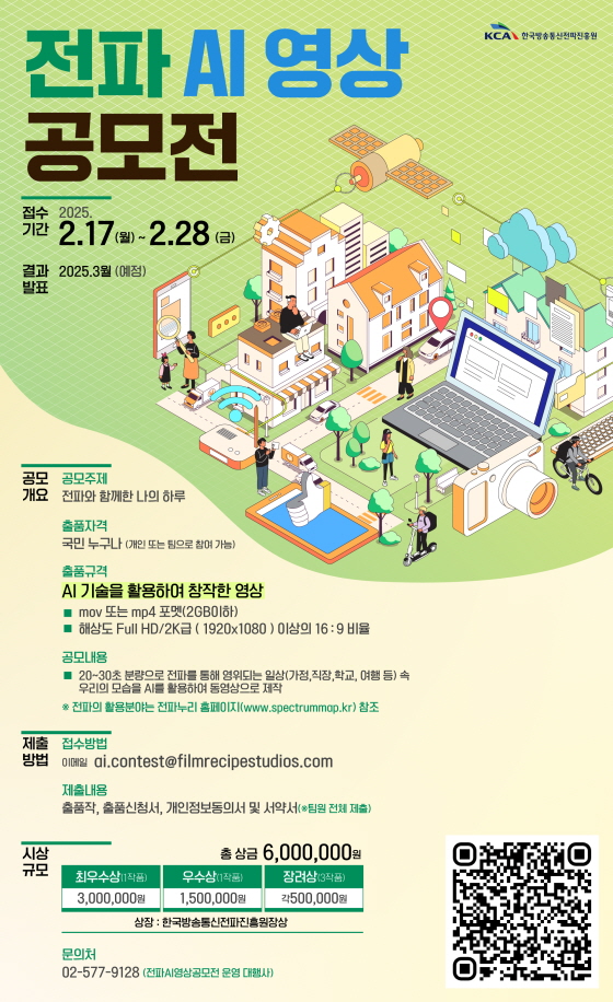 전파와 함께한 나의 하루, 전파 AI 영상 공모전 공모분야 사진/영상 접수기간2025.02.17 ~ 2025.02.28 D+402 종료 참가자격 제한없음 주최한국방송통신전파진흥원 1등상금(상품)200만원~499만원 홈페이지 바로가기 첨부파일 다운로드 유의사항 ※본 내용은 참고 자료로 내용의 오류와 변동에 대해 책임지지 않습니다. (오류 및 변동 신고는 상단의 '제안/오류' 신고를 통해 해주십시오.) ※주최사 사정에 따라 일정 및 내용이 변경될 수 있으니 주최사 홈페이지 등을 통해 관련 안내를 수시로 확인하시기 바랍니다. 상세내용 ■ 제목전파와 함께한 나의 하루, 전파 AI 영상 공모전 ■ 기간 - 접수기간 : 2025. 2. 17.(월) ~ 2. 28.(금) / 2주간 - 결과발표 : 2025. 3월(예정) ■ 참가자격 국민 누구나(개인 또는 팀으로 참여 가능) ■ 참여방법 / 접수방법◯ 공모주제 : 전파와 함께한 나의 하루 ◯ 공모내용 : AI 기술을 활용하여 창작한 영상- 20~30초 분량으로 전파를 통해 영위되는 일상 속 우리의 모습을 AI를 활용하여 동영상으로 제작 ◯ 출품규격 : mov 또는 mp4 포맷 (2GB이하) / 해상도 Full HD/2K 급(1920*1080) 이상의 16:9 비율 <제출방법> - 접수방법 : 이메일 제출 : ai.contest@filmrecipestudios.com - 제출내용 : ①출품작 ②출품신청서 ③개인정보동의서 및 서약서 (서약서는 팀원 전체 제출)※ 공고문 내 서식 참조 ■ 시상내용 / 혜택- 최우수상(1건) 300만원, 우수상(1건) 150만원, 장려상(3건) 각 50만원- 한국방송통신전파진흥원장상 수여 ■ 문의전파 AI 공모전 운영 대행사 : 02-577-9218 목록