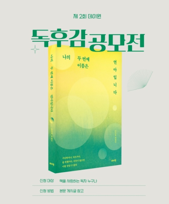제2회 데이원 독후감 공모전 "나의 두 번째 이름은 연아입니다" 공모분야 문학/시나리오 접수기간2025.01.06 ~ 2025.03.03 D+399 종료 참가자격 제한없음 주최데이원 1등상금(상품)100만원~199만원 홈페이지 바로가기 첨부파일 다운로드 유의사항 ※본 내용은 참고 자료로 내용의 오류와 변동에 대해 책임지지 않습니다. (오류 및 변동 신고는 상단의 '제안/오류' 신고를 통해 해주십시오.) ※주최사 사정에 따라 일정 및 내용이 변경될 수 있으니 주최사 홈페이지 등을 통해 관련 안내를 수시로 확인하시기 바랍니다. 상세내용 ■ 제목제2회 데이원 독후감 공모전 "나의 두 번째 이름은 연아입니다" ■ 기간 - 접수 기간 : 2025년 3월 3일까지 - 결과 발표 : 2025년 4월 1일 ■ 참가자격제한없이 누구나 ■ 참여방법 / 접수방법◯ 대상도서 : 나의 두 번째 이름은 연아입니다 ◯ 분량 : 공백 포함 1,500자 이상 <참여방법> 1. “나의 두 번째 연아입니다”를 읽고 감상 후, 독후감(서평 또는 리뷰)을 작성해 주세요. 2. 작성하신 글을 서점 사이트에 등록하세요. 3. 등록된 글의 URL을 데이원 블로그 공모전 공지글의 댓글란에 남기시면 접수가 완료됩니다. ■ 시상내용 / 혜택 - 1등 상금 100만 원 (제세공과금 및 해외 송금 시 송금 수수료 본인 부담) ■ 유의사항 - 제출하신 독후감은 데이원의 도서 홍보 자료로 활용될 수 있습니다. - 타인의 서평을 도용하거나 AI로 작성한 사실이 확인될 경우 수상이 취소되며, 상금 반환을 요구할 수 있습니다. 목록