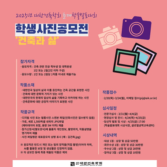 2025년 춘계학술발표대회 '제6회 학생사진공모전' 공모분야 사진/영상 접수기간2025.02.20 ~ 2025.03.24 D+378 종료 참가자격 제한없음 주최대한건축학회 1등상금(상품)100만원 이하 홈페이지 바로가기 첨부파일 다운로드 유의사항 ※본 내용은 참고 자료로 내용의 오류와 변동에 대해 책임지지 않습니다. (오류 및 변동 신고는 상단의 '제안/오류' 신고를 통해 해주십시오.) ※주최사 사정에 따라 일정 및 내용이 변경될 수 있으니 주최사 홈페이지 등을 통해 관련 안내를 수시로 확인하시기 바랍니다. 상세내용 ■ 제목2025년 춘계학술발표대회 '제6회 학생사진공모전' ■ 기간 - 접수기간 : 2025년 2월 20일(목) ~ 3월 24일(월) 18시 - 당선작 발표 및 시상 : 2025년 4월 25일(금) 17시, *글로벌공학교육센터 지하1층 다목적홀, 학술발표대회 시상식장(대표시상) ■ 참가자격 건축 관련 전공 학부생 및 대학원생 1인 또는 1팀(2인 이하 구성) ■ 참여방법 / 접수방법<작품 소재>- 대한민국 일상의 삶과 이를 증진하는 건축 공간을 표현한 사진- 건축에 대한 문화적 가치가 있는 사진- 대한민국의 현재의 일상의 삶을 기록하고 아카이빙 하는 사진- 건축문화에 대한 긍정적 이미지가 표현된 사진 <응모수량> 1인 또는 1팀당 1작품 이내로 제출가능 <작품규격> • 디지털 사진 또는 필름사진 스캔본 파일(인화사진은 접수받지 않음) • 가로, 세로 1,500픽셀 내외의 JPG파일 (메타데이터 포함, 용량 5M 이하) 제출 • 제공되는 참가신청서 양식에 출품자 개인정보, 촬영위치, 작품설명 명기하여 제출 - 사진 파일명은 대표응모자 성명을 표시함 (예 : 김건축.jpg) - 촬영 카메라의 기종 : 제한 없음 ※ 응모작은 반드시 개인 또는 팀의 창작물이어야 함.※ 사진은 카메라를 사용하여 출품자가 직접 촬영한 경우에 한하며, AI를 활용한 보정 및 생성물은 인정하지 않음.※ 타 공모전 등에 최종 제출된 작품은 제외 <신청방법> 이메일 제출(pij@aik.or.kr) *이메일 제출 시 제목은 “[학생사진공모전] 대표응모자 성명”으로 할 것 <제출물> 아래의 제출물의 파일명을 대표응모자의 성명으로 제출 1) 참가신청서(별도양식 2025년 학생사진공모전 참가신청서.hwp) 2) 사진파일 ■ 시상내용 / 혜택- 대상 1점 : 상장 및 상금 50만원 - 최우수상 1점 : 상장 및 상금 30만원- 우수상 2점 : 상장 및 상금 20만원 - 장려상 3점 : 상장 및 상금 10만원 ■ 문의학술연구본부 박인자 팀장 02-525-1844 목록