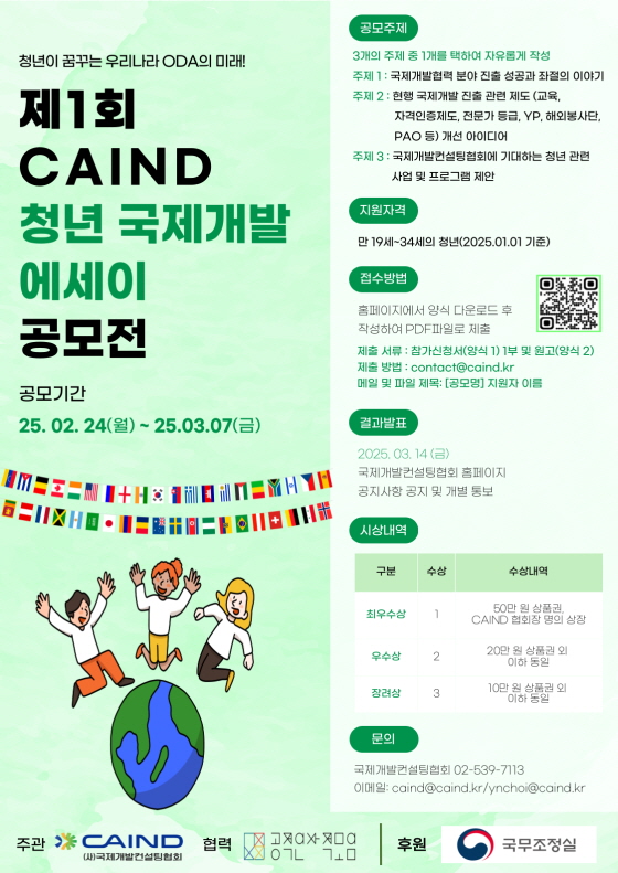 제1회 CAIND 청년 국제개발 에세이 공모전 공모분야 문학/시나리오 접수기간2025.02.24 ~ 2025.03.07 D+396 종료 참가자격 제한없음, 대학(원)생/청년, 기타 제한 주최국제개발컨설팅협회 후원/협찬국무조정실 1등상금(상품)기타 홈페이지 바로가기 첨부파일 다운로드 유의사항 ※본 내용은 참고 자료로 내용의 오류와 변동에 대해 책임지지 않습니다. (오류 및 변동 신고는 상단의 '제안/오류' 신고를 통해 해주십시오.) ※주최사 사정에 따라 일정 및 내용이 변경될 수 있으니 주최사 홈페이지 등을 통해 관련 안내를 수시로 확인하시기 바랍니다. 상세내용 ■ 제목제1회 CAIND 청년 국제개발 에세이 공모전 ■ 기간 - 접수기간 : 2025.02.24(월) ~ 2025.03.07(금) - 결과발표 : 2025.03.14.(금) / 홈페이지 공지 및 개별 통보 ■ 참가자격 만19세 ~ 34세의 청년(2025년 1월 1일 기준) ■ 참여방법 / 접수방법<공모 주제> 아래 3개의 주제 중 1개를 택하여 자유롭게 작성 - 주제 1 : 국제개발협력 분야 진출 성공과 좌절의 이야기 - 주제 2 : 현행 국제개발 진출 관련 제도 (교육, 자격인증제도, 전문가 등급, YP, 해외봉사단, PAO 등) 개선 아이디어 - 주제 3 : 국제개발컨설팅협회에 기대하는 청년 관련 사업 및 프로그램 제안 <접수 방법> - 홈페이지에서 양식 다운로드 후 작성하여 PDF 파일로 제출 - 제출 서류 : 참가신청서(양식 1) 및 원고(양식 2) - 제출 이메일 : contact@caind.kr - 메일 및 파일 제목 : [공모명] 지원자 이름 ■ 시상내용 / 혜택 - 최우수상 1명 : 50만원 상품권, 협회장 명의 상장 - 우수상 2명 : 20만원 상품권, 협회장 명의상장 - 장려상 3명 : 10만원 상품권, 협회장 명의상장 ■ 문의국재개발컨설팅협회 - 전화 : 02-539-7113 - 이메일 : caind@caind.kr / ynchoi@caind.kr 목록