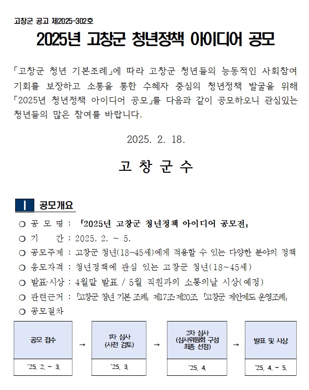 2025년 고창군 청년정책 아이디어 공모 공모분야 기획/아이디어/마케팅, 정책 제안 접수기간2025.02.18 ~ 2025.03.18 D+385 종료 참가자격 지역한정, 기타 제한 주최고창군 1등상금(상품)100만원~199만원 홈페이지 바로가기 첨부파일 다운로드 유의사항 ※본 내용은 참고 자료로 내용의 오류와 변동에 대해 책임지지 않습니다. (오류 및 변동 신고는 상단의 '제안/오류' 신고를 통해 해주십시오.) ※주최사 사정에 따라 일정 및 내용이 변경될 수 있으니 주최사 홈페이지 등을 통해 관련 안내를 수시로 확인하시기 바랍니다. 상세내용 ■ 제목2025년 고창군 청년정책 아이디어 공모 ■ 기간 - 접수 기간 : 2025. 2. 18. ~ 3. 18. (한달간) ■ 참가자격청년정책에 관심 있는 고창군 청년(18~45세) ■ 참여방법 / 접수방법<공모주제> 고창군 청년(18~45세)에게 적용할 수 있는 다양한 분야의 정책 <공모분야> 분 야세부내용복지·금융 교통, 주택, 의료, 교육, 자산형성 등 일상생활 부문창업 청년 창업 생태계 조성 등 지원 및 장려 정책 취업·일자리 맞춤형 청년 일자리 지원 및 장려 정책주거 청년 주거시설 및 청년 공간 운영방안 기타 그 밖의 청년의 권리 증진을 위한 정책 등 <신청방법>신청서 서식에 맞게 작성하여 온·오프라인 제출 - 이메일 : yhd0627@korea.kr - 방문·우편 : 고창군청 3층 신활력경제정책관 청년창업팀(고창군 고창읍 중앙로 245) <제출서류> 신청서, 제안서, 개인정보제공동의서, 주민등록 초본 각 1부 (제출서류 양식은 첨부파일 다운로드) ■ 시상내용 / 혜택 순 위상 금비 고최우수상(1건)100만원상장 수여(훈격 : 고창군수)우수상(1건)50만원장려상(2건)30만원 ※ 순위에 해당하는 제안이 없을 경우 시상하지 않음. ※ 1인이 여러 건의 과제가 선정됐을 경우 상위 등급의 1건만 시상함. ※ 동일한 내용의 정책이 선정된 경우, 먼저 접수된 제안을 시상함. ■ 유의사항 - 신청서 등 신청서류 제출 시 서류는 반환하지 않으며, 기재 내용이 사실과 다를 경우 취소될 수 있음 ■ 문의 고창군 신활력경제정책관 청년창업팀(560-2367) 목록