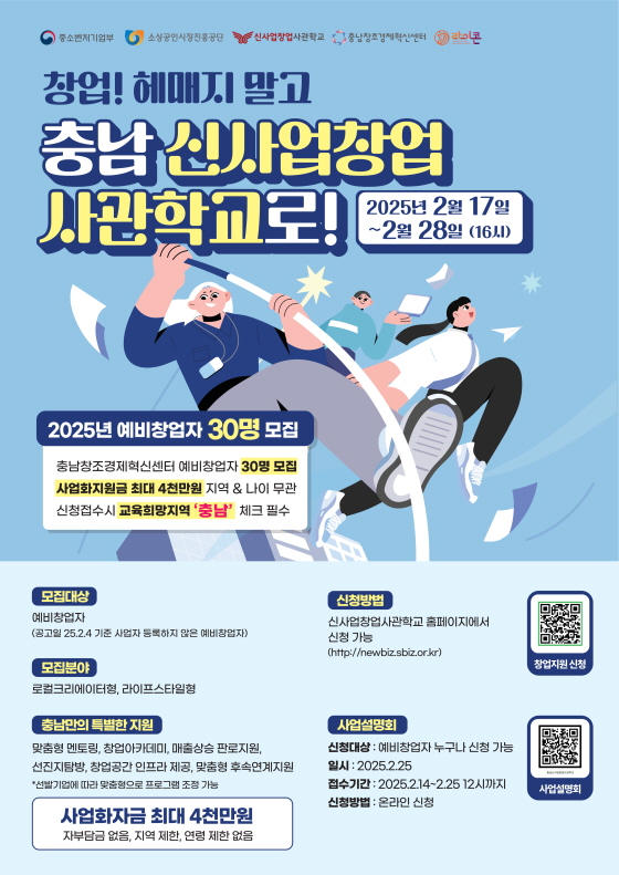 2025년 신사업창업사관학교(충남, 전국) 예비창업자 모집 공모분야 창업/사업 지원 접수기간2025.02.17 ~ 2025.02.28 D+403 종료 참가자격 기타 제한 주최충남창조경제혁신센터 주관충남창조경제혁신센터 1등상금(상품)1천만원 초과 홈페이지 바로가기 첨부파일 다운로드 유의사항 ※본 내용은 참고 자료로 내용의 오류와 변동에 대해 책임지지 않습니다. (오류 및 변동 신고는 상단의 '제안/오류' 신고를 통해 해주십시오.) ※주최사 사정에 따라 일정 및 내용이 변경될 수 있으니 주최사 홈페이지 등을 통해 관련 안내를 수시로 확인하시기 바랍니다. 상세내용 ■ 제목2025년 신사업창업사관학교(충남, 전국) 예비창업자 모집 ■ 개요연령, 지역 제한 없는 창업지원사업 충남지역뿐 아니라 전국적으로 시행되는 창업지원사업입니다. 지원규모 : 총 510명 이내 ※ 지역별 예비창업자 모집 규모 서울인천경기수도권(로컬)부산대구광주대전울산503045304035302520세종강원충북충남전북전남경북경남제주 202020302520203020 * 수도권(서울, 인천, 경기) 지역만 유형에 따라 모집 지역을 구분①로컬크리에이터 유형인 경우 ’수도권(로컬크리에이터형)‘으로 신청하고, ②라이프스타일 유형의 경우 ’서울, 인천, 경기‘로 신청 ■ 기간 - 신청기간 : ‘25. 2. 17. ( 월 ) ∼ 2 . 28. ( 금 ) , 16:00 / 타 지역 사업들의 경우 신청기간 확인 필요. ※ 신청 · 접수 마감 유의사항1) 신청 마감일에 사용자 문의 및 접속 건이 급증하여, 시스템 사용에 일부 장애가 발생할 수 있으니, 가급적 마감일 2~3 일 이전에 미리 진행하는 것을 권장2) 온라인으로만 신청이 가능 하고, 접수된 사업계획서 등 일체 내용 삭제 불가3) ‘신청하기‘ 버튼을 클릭해야 접수 신청이 완료됨 - 사업설명회 : 2025. 02. 25.(화) 14:00 (라이콘타운 아산(충남 아산시 배방로5, 충무빌딩2층)) - 사업기간 : 선정 후 사업종료일까지(선정일 ~ ‘25.11월 말(예정)) ■ 참가자격 연령, 지역에 상관없이 예비창업자 모집 (상세 기준은 공고문 참조) ■ 지원방법<신청 유형> ➊ 로컬크리에이터형 ➋ 라이프스타일형지역 고유의 특성과 자원에 혁신적인 아이디어를 접목하여 지역경제 활성화에 기여하는 ‘지역가치 창업자’로 창업의식주 기반의 생활양식(라이프스타일)에 새로운 콘텐츠를 접목한 신사업 아이디어로 창업 * 신청유형에 따라 특화프로그램 일부 상이(세부 프로그램은 지역별 상이) * 분야 택 1 (중복신청 불가) <신청방법> 소상공인 24 홈페이지(www.sbiz24.kr) 통해 신청※ 시스템 접수 시 충남 지역 신청 시에는 ’ 충남 ‘ 에 체크 필수 <제출서류> 구분 제출서류명 서식비고 필수1사업신청서 -홈페이지 작성 2개인정보 수집·이용 및 제공 동의서 -3사업계획서서식파일 첨부선택1가점 증빙자료-사업계획서에 제출서류 첨부 ※ 제출서류 유의사항1) 사업신청서 및 계획서, 개인정보동의서는 홈페이지를 통해 작성2) 사업계획서는 반드시 동 공고 내 게시된 양식[서식]을 사용하여야 하며, 임의 양식의 사업계획서 제출 시 선정평가 대상에서 제외3) 가점 증빙서류는 사업 신청시 제출하며, 미제출 시 가점 불인정 ■ 지원 내용사업화 자금(최대 4천만원 이내, 평균 2천만원) ※ 예비창업자의 창업아이템 유형에 따른 지원 프로그램 및 사업화 자금 지원(2회 분할 지급, 자부담금 없음) - 예비창업자 대상 창업상담·지도 및 코칭을 실시하고, 아이템 구체화 등 창업 역량 강화를 위한 아카데미를 통한 창업 준비 지원 - 사업화자금 지원(1천 5백만원) 및 전문가 멘토링 등을 통해 창업 아이템의 사업화를 지원 - 사업화 자금 추가 지원, IR피칭 등 투자연계, 보육공간 제공(필요시) 및 연계사업 코칭 지원 ■ 유의사항기타 상세한 내용 및 자세한 사항은 홈페이지 공지 및 공고문을 참조 바랍니다. ■ 문의 - 시스템 관련 오류 : 1644-5302 <사업관련 질의>충남지역으로 접수하는 경우 충남창조경제혁신센터 041-536-7837 / 1-536-7814 타 지역으로 접수하는 경우 각 지역의 창조경제혁신센터에 문의 목록